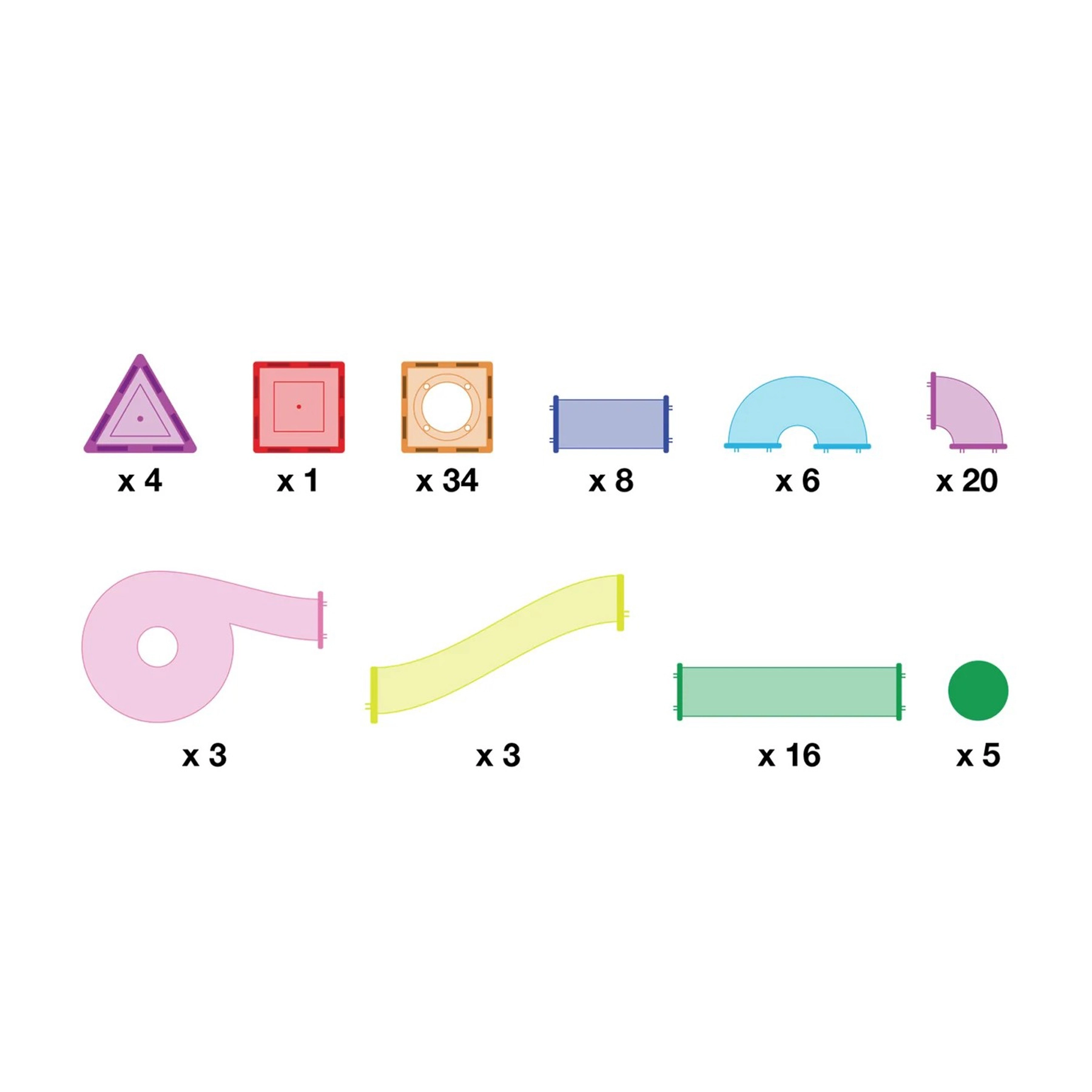 Ši magnetinė rinkinė leidžia vaikams kurti ir statyti savo rutuliukų lenktynių trasas, kuriomis rutuliukai rieda posūkiais ir nuolydžiais. Dėl tvirtų magnetinių jungčių konstrukcijos yra stabilios ir lengvai perstatomos. Permatomos spalvotos detalės suteikia projektams patrauklią išvaizdą ir padeda pažinti formas bei spalvas.
