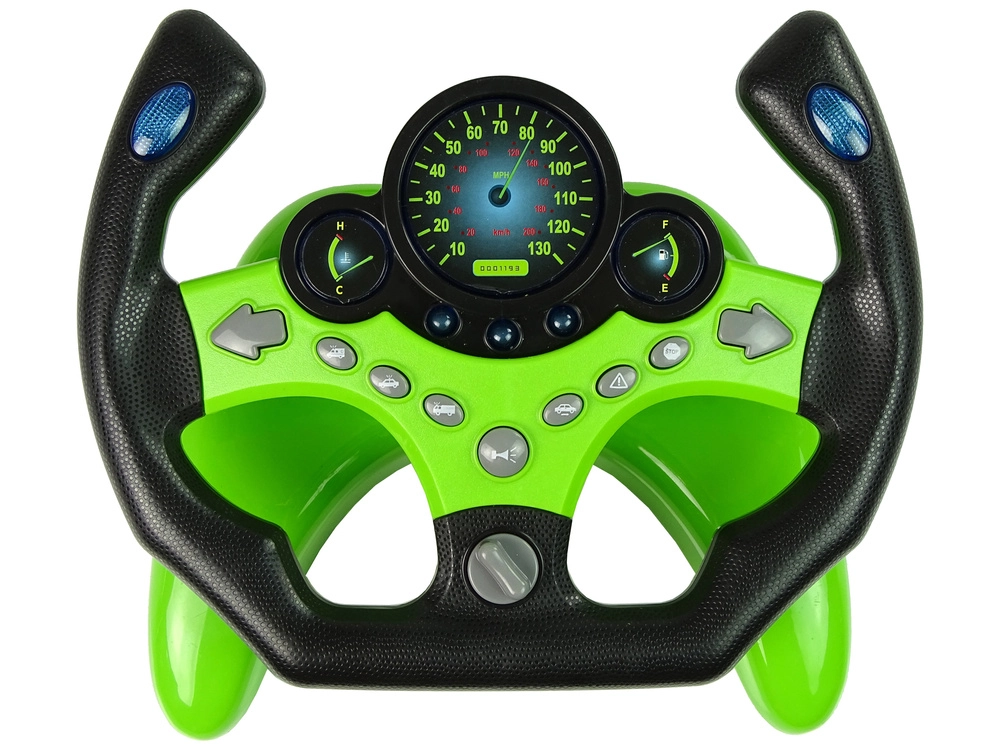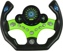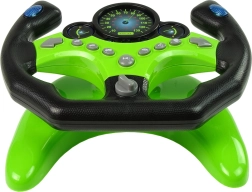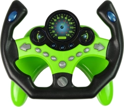 Šis žaliai juodas vaikiškas vairas siūlo net 9 funkcinius mygtukus, įskaitant posūkius, garsinį signalą ir specialiųjų tarnybų garsus. Pasukus raktelį, mėlynai apšviečiami prietaisai, ir mažasis vairuotojas gali leistis į „kelią“. Stabilus pagrindas su siurbtukais tvirtai laiko vairą ant stalo.