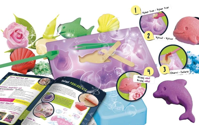 Šis smagus ir edukacinis rinkinys leis lengvai pasigaminti originalius muilus su jūrų gyvūnų motyvais. Dėka paruoštų formelių ir glicerino dribsnių procesas yra paprastas, saugus ir greitas. Įdėkite spalvinę esenciją ir mėgstamą kvapą – sukurkite dovanas ar kvapnią vonios puošmeną.