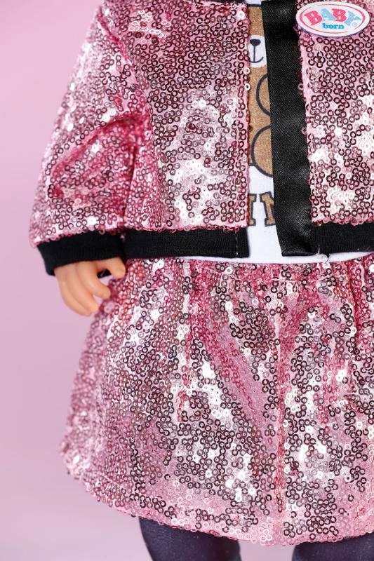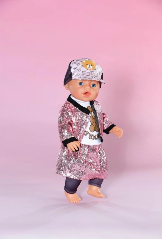Suteikite savo lėlei arba meškiukui BABY born Teddy išskirtinį stilių su šiuo blizgančiu drabužių rinkiniu, skirtu 43 cm dydžiui. Rinkinyje yra rožinė blizgučių striukė, sijonas, marškinėliai su meškiuko atvaizdu, kepurė ir tamprės – idealiai tinka kūrybingam ir ilgai trunkančiam žaidimui. Taip pat pridedamas pakabas iš perdirbtos medžiagos tvaresniam žaidimui.