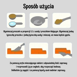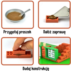 Valdymas paprastas: sumaišykite miltelius su vandeniu santykiu 1:1, tepkite skiedinį mentelėmis ir dėkite plytas sluoksnis po sluoksnio. Baigtą namą pakartotiniam naudojimui galima panardinti į šiltą vandenį 1–3 valandoms – skiedinys ištirps, o dalis galima panaudoti vėl. Vaikiški įrankiai pakuotėje moko teisingų judesių ir lavina smulkiąją motoriką.