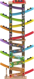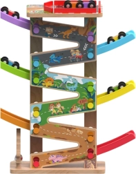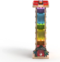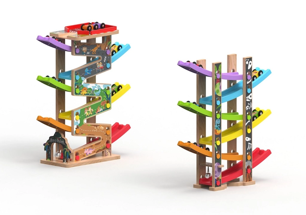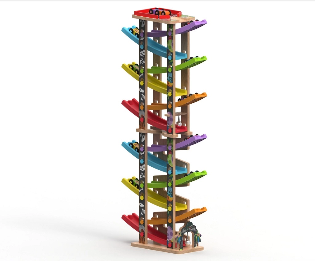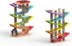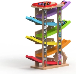 Ši vertikali medinė lenktynių bokšto trasa su 6 spalvotomis rampomis suteikia dinamišką, gravitacija paremtą žaidimą. Vaikai uždeda automobiliuką viršuje ir stebi, kaip jis skrieja žemyn per skirtingus lygius, posūkius ir tiltelius. Dėl stabilios konstrukcijos ir kompaktiškų matmenų trasa tinka vaikų kambariui ar žaidimų erdvei ir puikiai atlaiko intensyvų naudojimą.