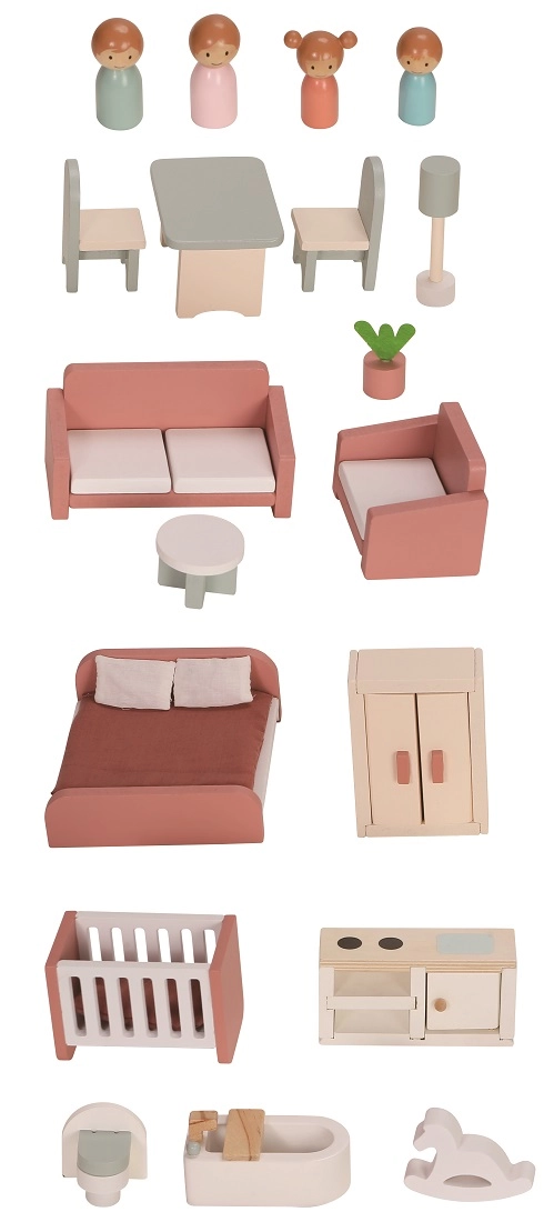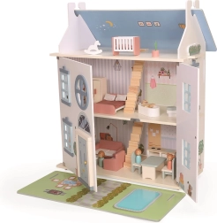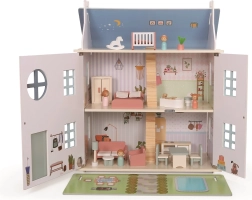 Namelis pagamintas iš kokybiškos medienos ir papildytas tekstiliniais bei veltinio elementais. Į komplektą įeina baldai ir figūrėlės, tad vaikai gali pradėti žaisti iškart. Atidaromi paneliai palengvina priėjimą prie interjero, o detalūs kambarių atspaudai skatina tikrovišką žaidimą. Tvirta konstrukcija užtikrina ilgą tarnavimo laiką ir saugų naudojimą.