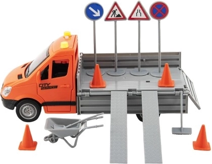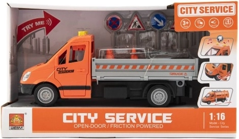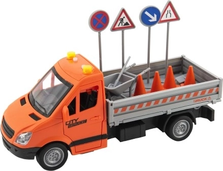 Rūpinkitės miesto tvarka su detaliu kelio priežiūros sunkvežimiu. Dėl inercinės pavaros transporto priemonė pajuda pastūmus, šviesos ir garso efektai sustiprina tikro kelio darbų atmosferą, o pridėti ženklai, kūgiai ir priemonės praplečia žaidimo scenarijus.