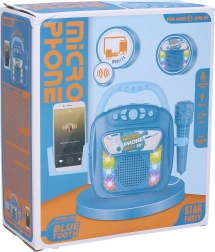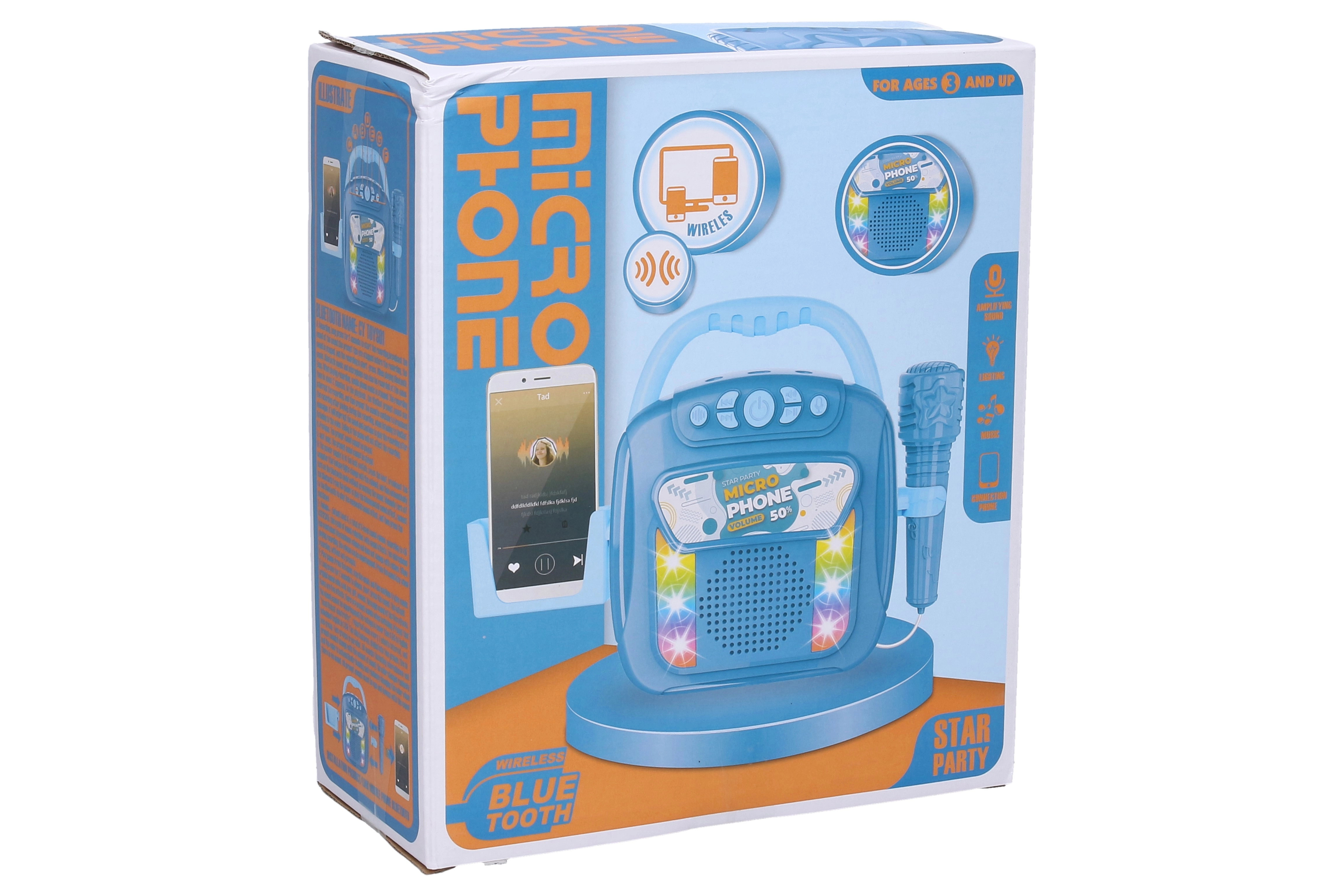 Nešiojama muzikinė dėžė su mikrofonu ir belaidžiu Bluetooth ryšiu pradžiugins tiek vaikus, tiek suaugusiuosius. Ji siūlo šviesos efektus, įrašymo galimybę, lengvą garso stiprumo reguliavimą ir dainų perjungimą. Pakuotėje rasite USB įkrovimo kabelį, mobiliojo telefono laikiklį ir 3,7 V baterijų bloką – viskas paruošta iškart naudoti.