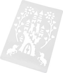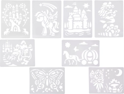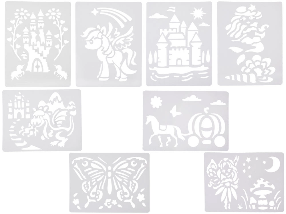 Į pakuotę įeina daugkartiniai plastikiniai trafaretai su mėgstamais motyvais (pvz., drugelis, pilys, drakonas, undinėlė, arkliukas su karieta, miško fėja, arklys/kumeliukas), 12 spalvotų flomasterių, 10 popieriaus lapų ir stebuklinga pompa. Trafaretus po naudojimo pakanka palikti išdžiūti ir galite kurti vėl.