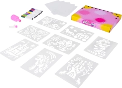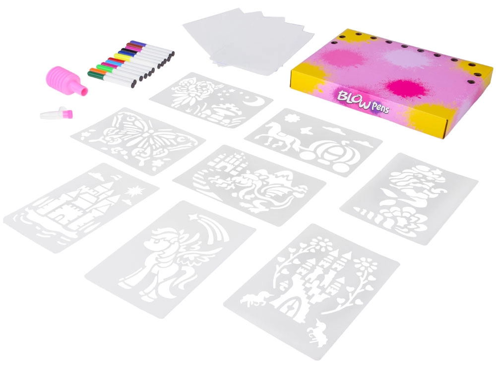 Šis unikalus meninis rinkinys pavers įprastą piešimą įspūdžiu. Tereikia įstatyti flomasterį į rankinę pompą, nukreipti į trafaretą ir lengvai spaudžiant išpurkšti spalvą. Taip sukuriami įspūdingi taškuoti ir švelniai purškiami motyvai. Spalvas galima laisvai keisti darbo metu, todėl kiekvienas piešinys bus visiškai originalus.