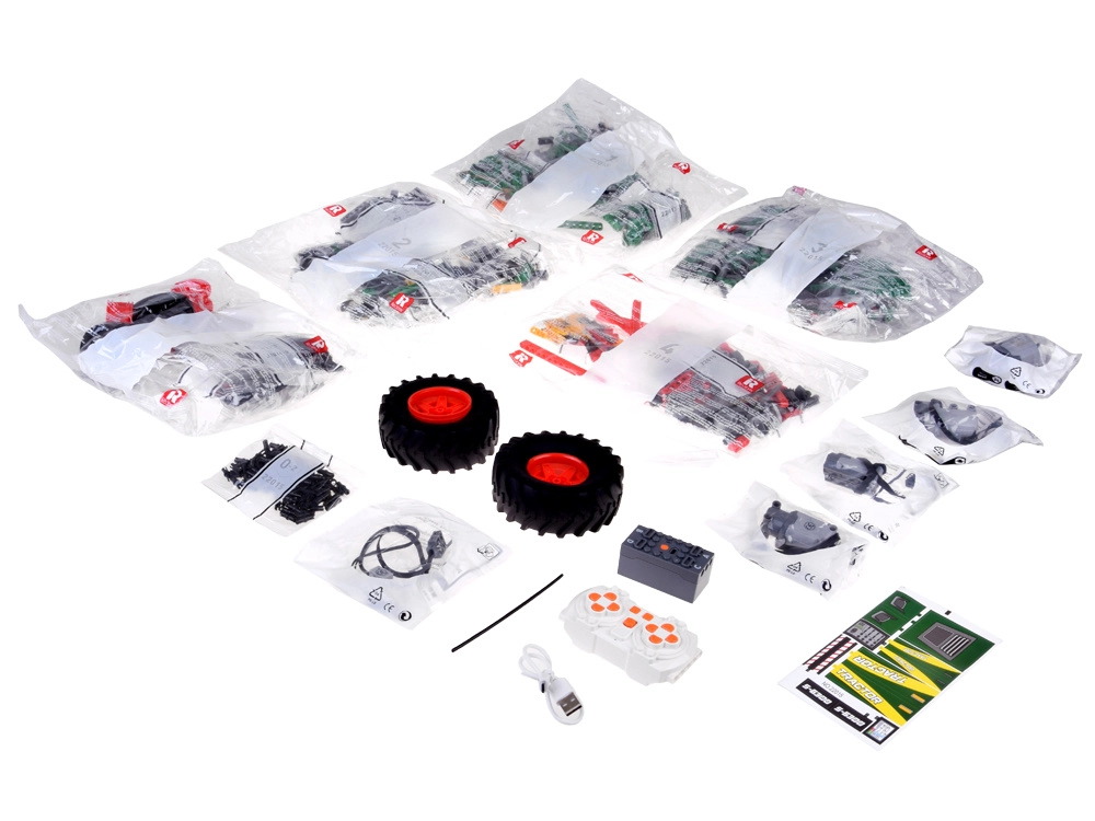 Komplekte yra aiški iliustruota instrukcija, lipdukai, USB laidas ir nuotolinis valdiklis. Konstruktorius lavina smulkiąją motoriką, loginį mąstymą ir techninius įgūdžius – nuo pavarų iki servo vairavimo.