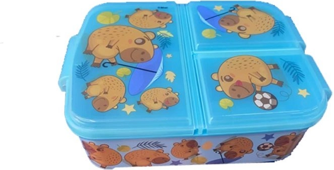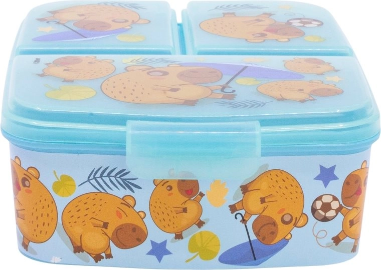 Praktiška ir stilinga užkandžių dėžutė su kapibaros motyvu vaikams į mokyklą, žaidimų aikštelę ar išvykas. Siūlo 3 atskirus skyrius, pagaminta iš patvarios medžiagos, be BPA ir turi patrauklų dangtelio dekorą.