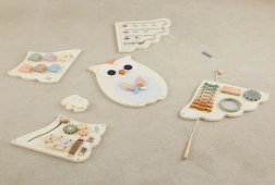 Metalofonas, krumpliaračiai, labirintas, stumdomi ir atidaromi elementai, karoliukai ir durelės su staigmena – visa tai skatina vaikus tyrinėti ir lavina smulkiąją motoriką bei logiką.