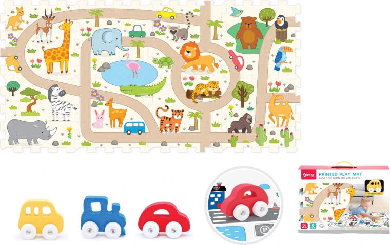 Atraskite smagų ir saugų žaidimą su šiuo minkštų blokų ir safario automobiliuko rinkiniu. Rinkinyje yra 8 minkšti blokai, kurių matmenys 31,5 × 31,5 × 1 cm, ir automobiliukas su laisvai riedančiais ratais, kuris skatina kūrybiškumą, motoriką ir saugų žaidimą namuose ar darželyje.