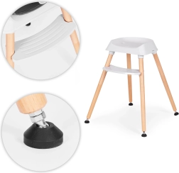 5 taškų diržai, tarpkojis ir stabilios medinės kojelės su neslystančiais antgaliais saugo vaiką nuo nuslydimo ir užtikrina maksimalų stabilumą.