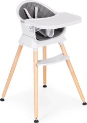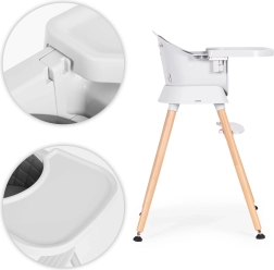 Nuimamas padėklas su paaukštintu kraštu palaiko tvarką maitinant ir gali būti plaunamas indaplovėje. 5 taškų diržai ir saugos tarpkojis apsaugo vaiką nuo nuslydimo, o neslystantys antgaliai ir tvirtos medinės kojelės suteikia kėdutei stabilumo net ant lygių grindų. Lengvai prižiūrimą dygsniuotą eko odos apdangalą pakanka nuvalyti drėgna šluoste.