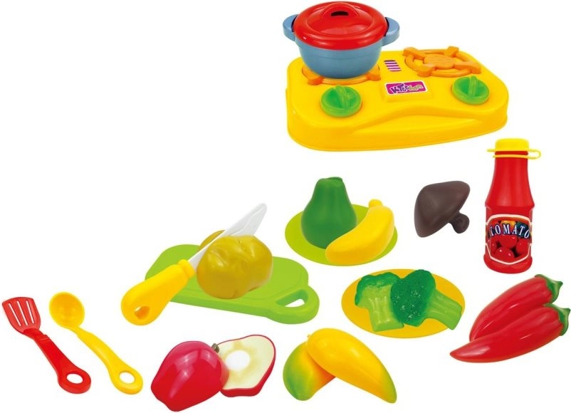 Smagus rinkinys vaikų virtuvei – vaisių ir daržovių pasirinkimas, kuriuos galima „pjaustyti“ ir vėl sujungti naudojant lipnias juosteles (Velcro). Praktiškas krepšelis palengvina laikymą ir nešiojimą. Idealiai tinka smulkiajai motorikai lavinti ir vaidmenų žaidimams gaminant maistą. 17 dalių rinkinys, pjaustomas maistas su lipniomis juostelėmis, praktiškas krepšelis.