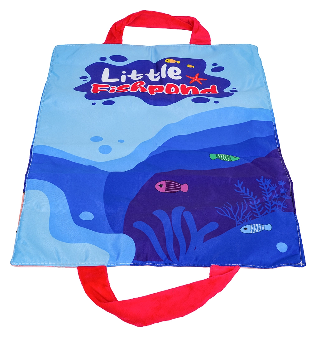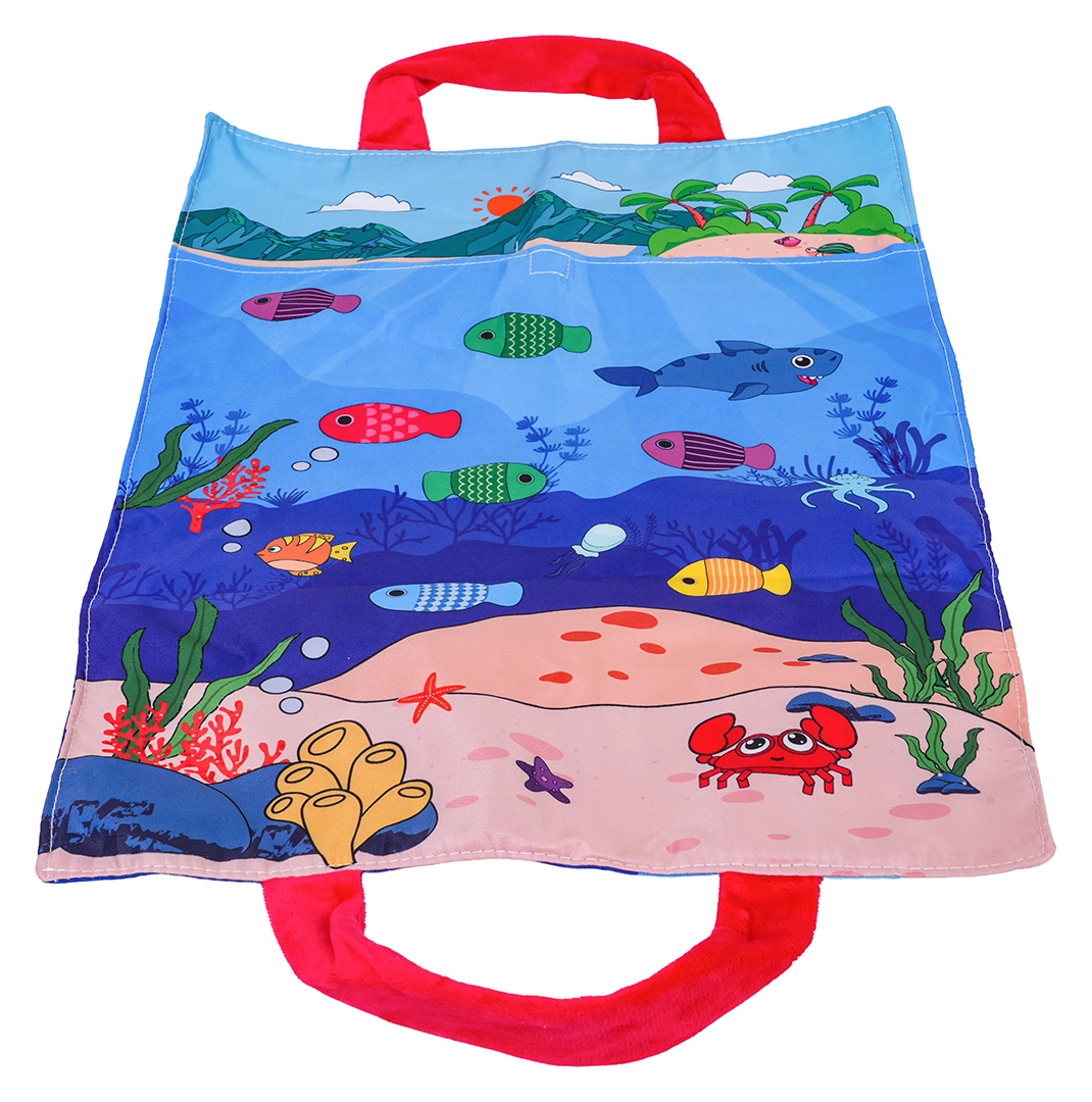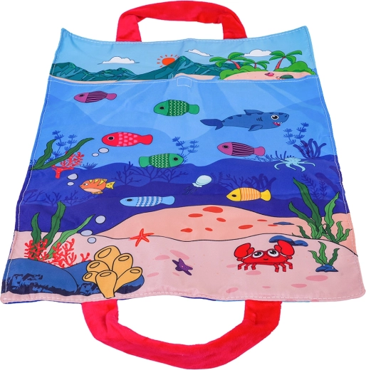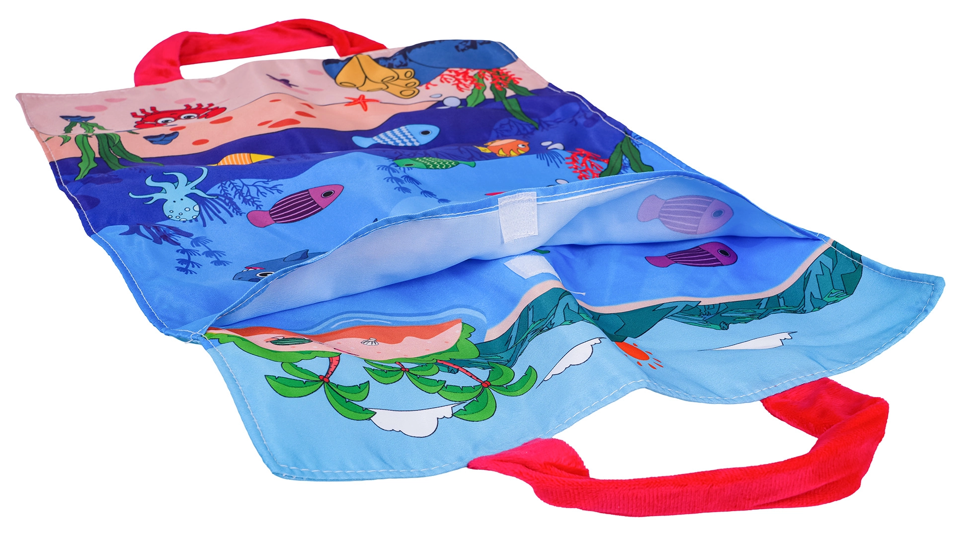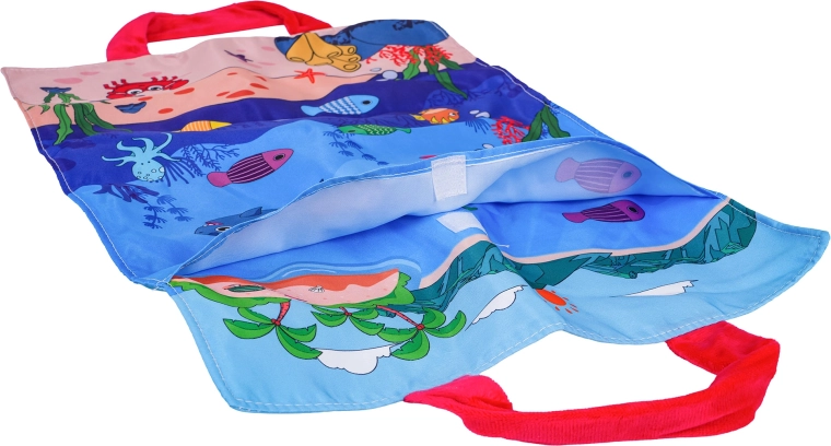 Jūrinio motyvo kilimėlis turi įsiūtas rankenėles ir gali būti naudojamas kaip nešiojamas krepšys. Visas dalis lengvai supakuosite ir pasiimsite į kelionę ar svečius.