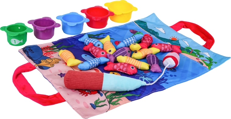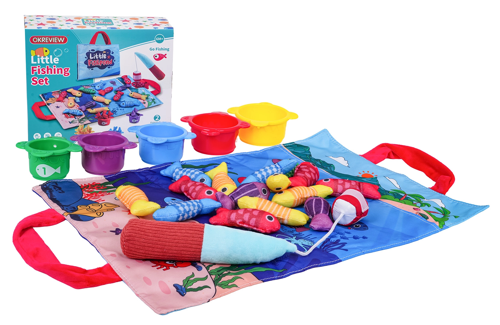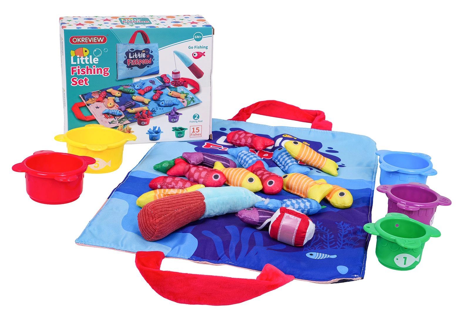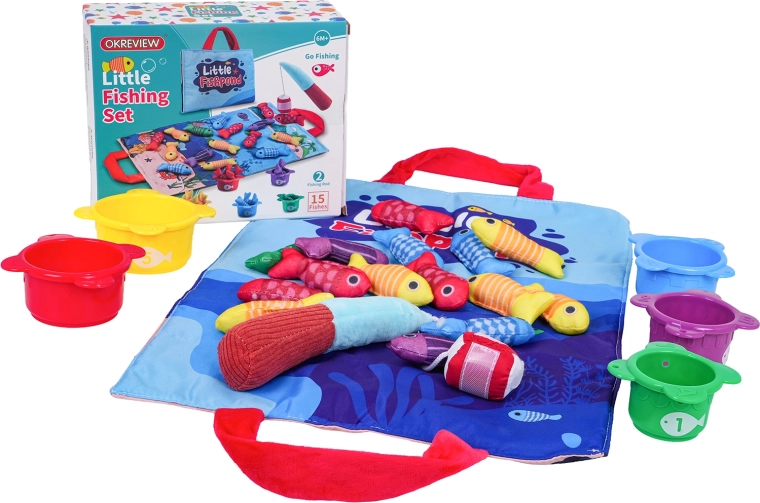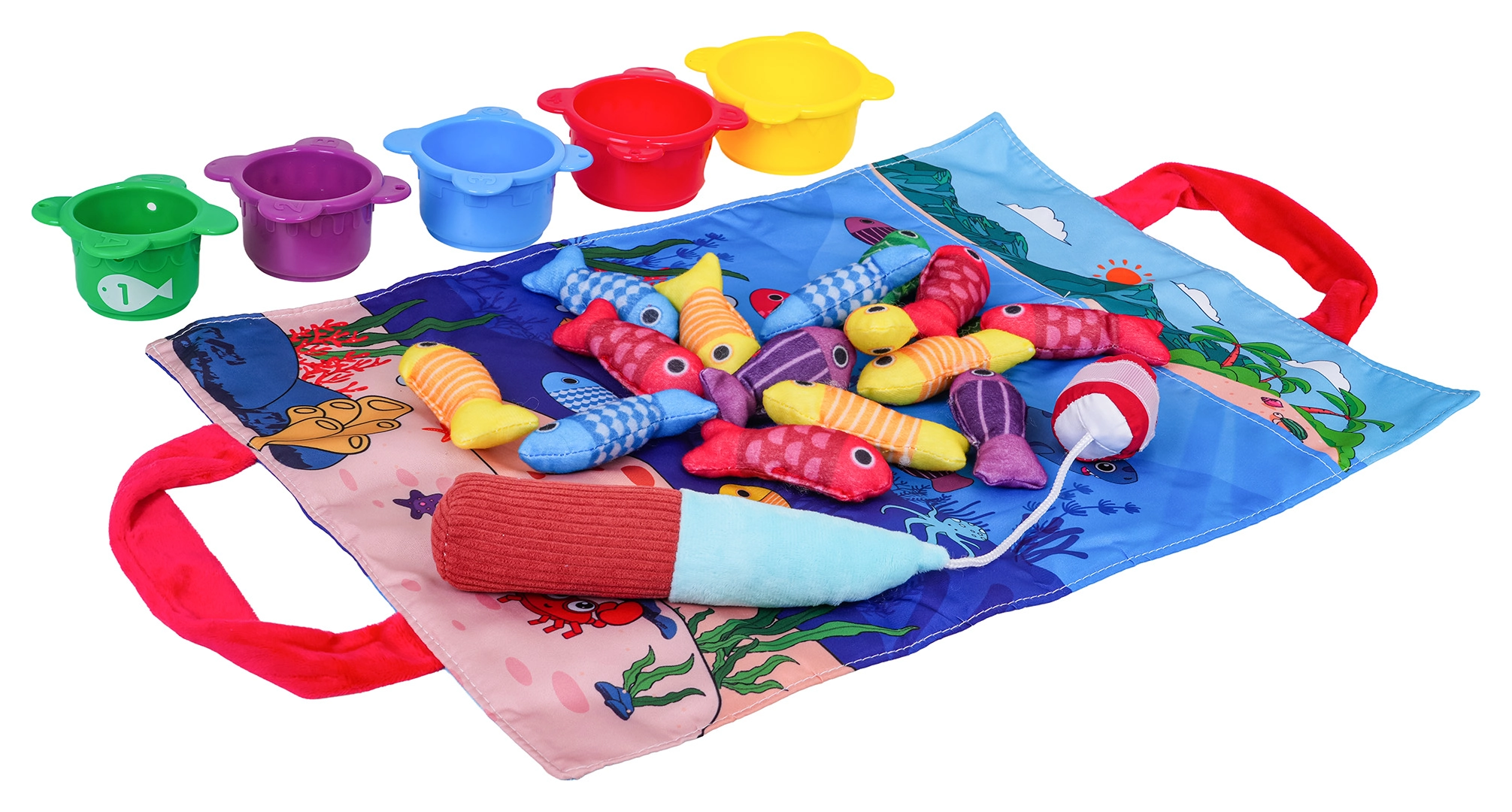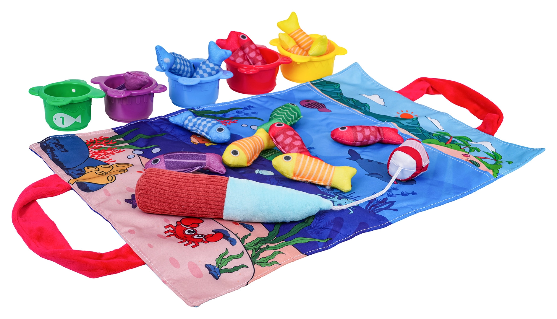Atraskite smagią veiklą patiems mažiausiems: minkštas žvejybos rinkinys su audiniu kilimėliu, 15 žuvyčių, 5 puodeliais ir minkšta meškere su lipduku. Skatina smulkiosios motorikos vystymą, akių–rankų koordinaciją, spalvų ir skaičių mokymąsi bei rūšiavimą ir skaičiavimą. Praktiškas kilimėlis su nešimo rankenėlėmis taip pat tinka visam rinkiniui laikyti kaip krepšys.