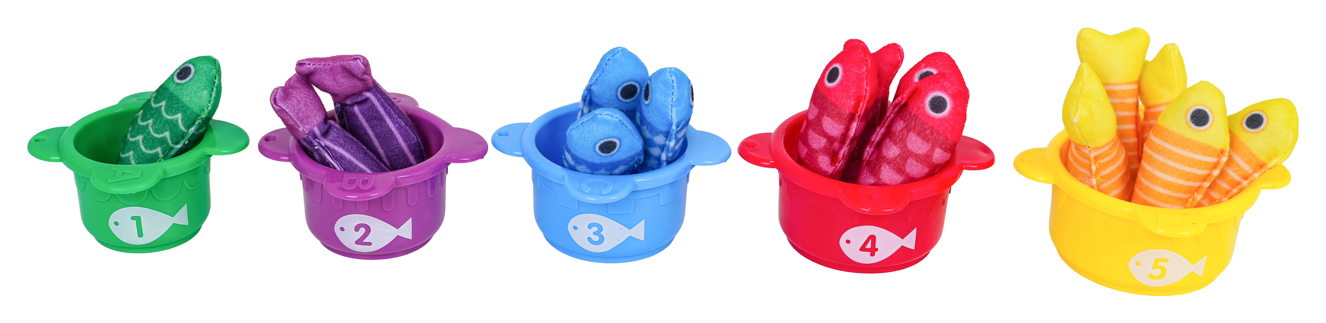 Penki puodeliai su skaičiais 1–5 ir atitinkamų spalvų žuvytės moko vaikus rūšiuoti pagal spalvą ir paprastai skaičiuoti. Puikiai lavina logiką ir ikimokyklinius įgūdžius.