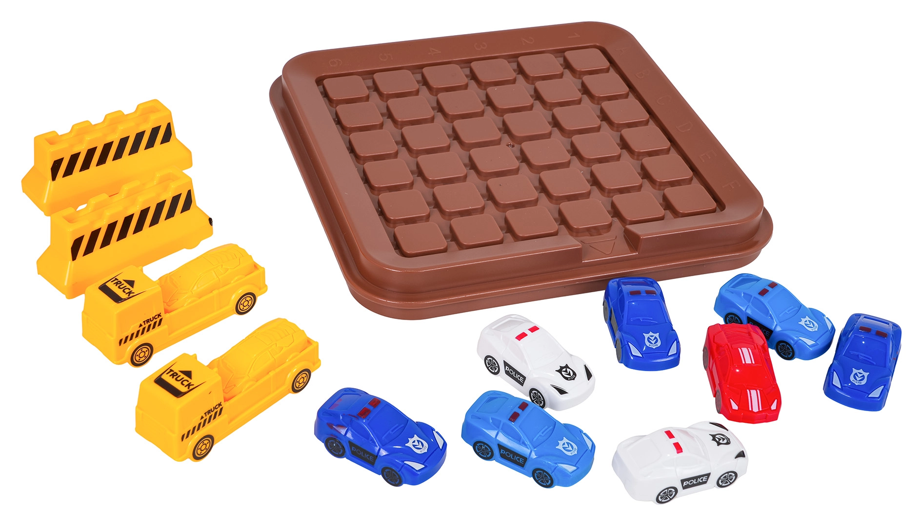- Rinkinio turinys: žaidimo lenta, raudona transporto priemonė, 2 barjerai, 2 sunkvežimiai, 7 policijos automobiliai, instrukcijos