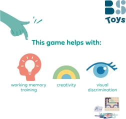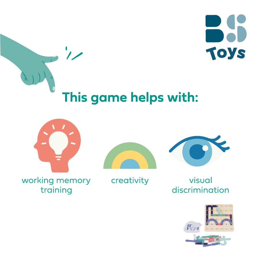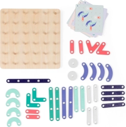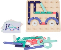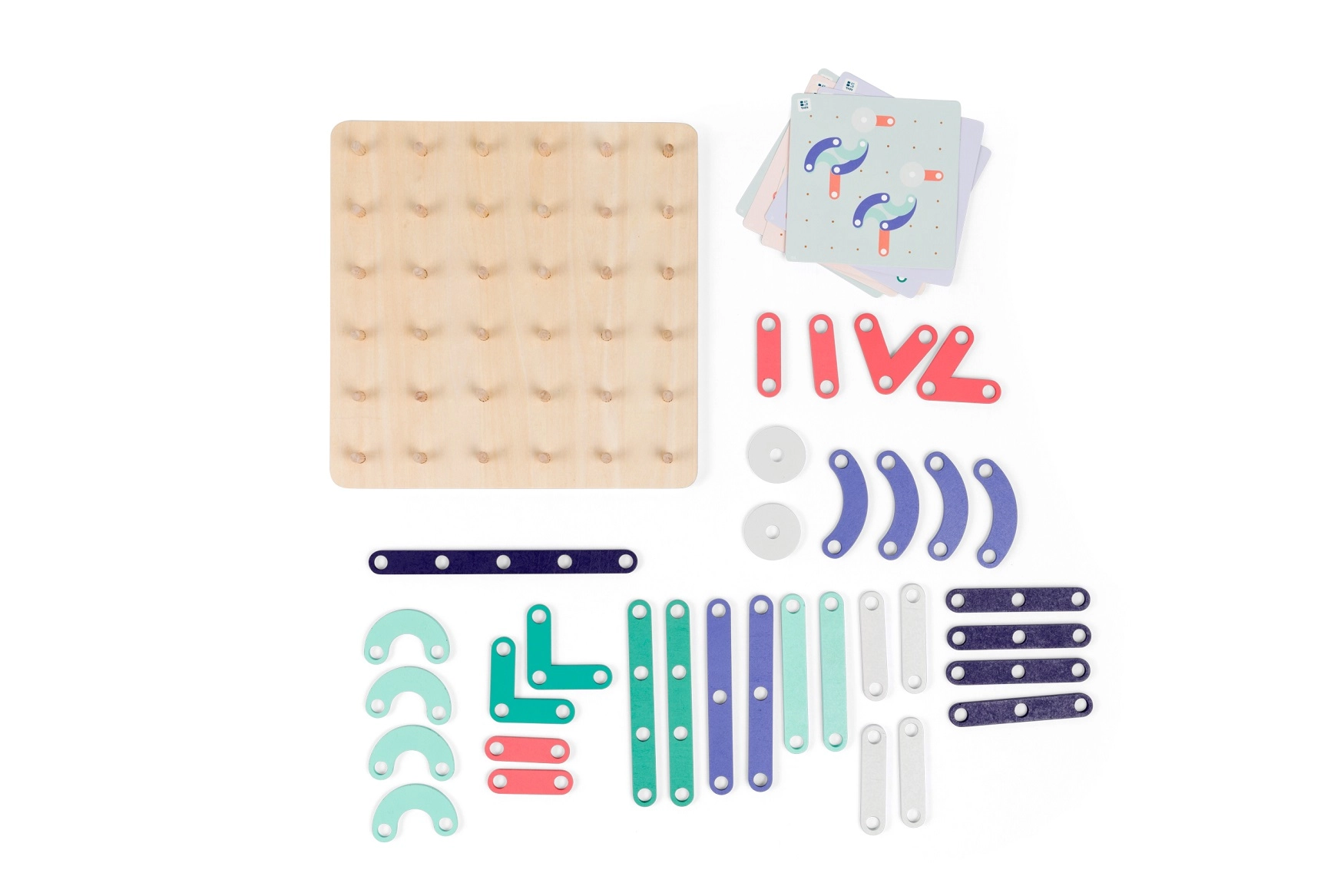 Rinkinyje yra tvirta medinė pagrindo lenta ir pavyzdžių kortelės, kurių sudėtingumas pamažu didėja. Žaidimas puikiai tinka namų pramogoms ir ikimokyklinėms ugdomosioms veikloms – žaisdami vaikai mokosi dirbti su formomis, spalvomis ir erdve.