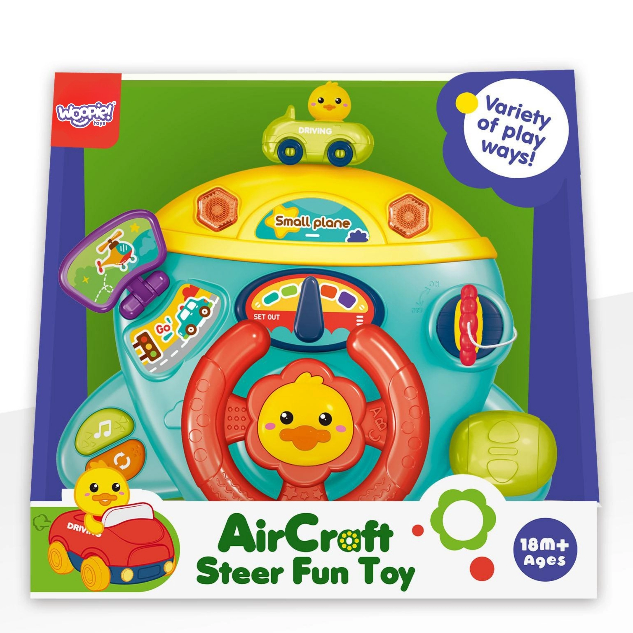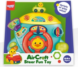 Linksmas interaktyvus lėktuvo formos žaislas pavers kiekvieną pasivaikščiojimą ir laiką lovytėje nuotykiu. Dėl vairo, švieselų ir garsų vaikas galės žaisti pilotą ir kartu lavinti įgūdžius. Lengvas tvirtinimas naudojant lipnias juosteles su „Velcro“ užtikrina saugų naudojimą namuose ir kelionėje. Šviesos ir muzikiniai efektai, judantys elementai ir anties formos vairas skatina rankų ir akių koordinaciją bei vaizduotę.