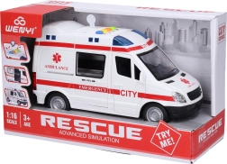 Realistiškas greitosios pagalbos automobilis su inercine pavara, 21 cm ilgio, su šviesos ir garso efektais. Siūlo atsidarančias priekines ir stumdomas galines dureles dar daugiau pramogų. Baterijos 3× AG13 yra pakuotėje, todėl vaikai gali žaisti iškart išėmę iš dėžutės.