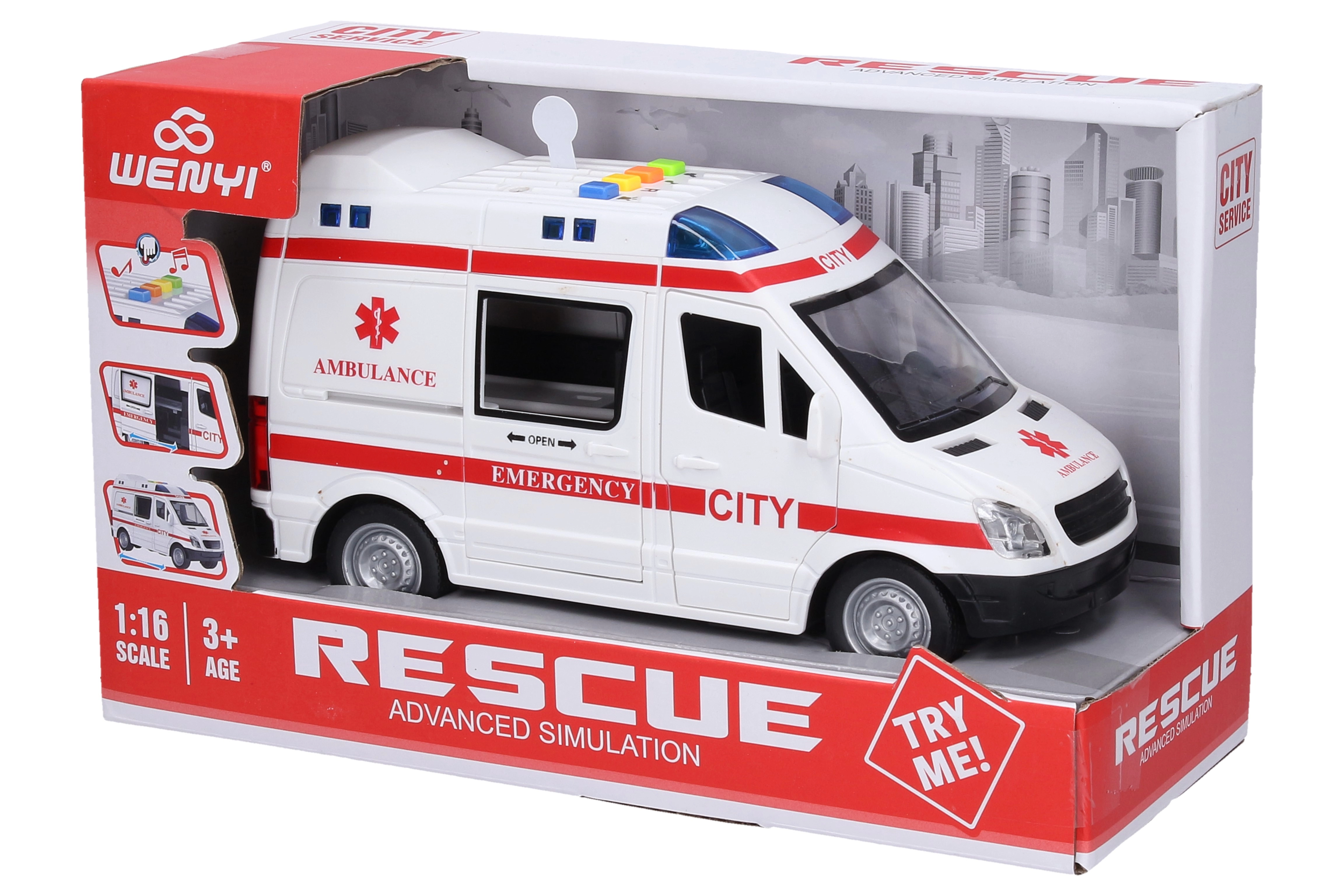 Šis detaliai sukurtas greitosios pagalbos automobilis pradžiugins visus mažus vairuotojus ir gelbėtojų gerbėjus. Dėl inercinės pavaros jis lengvai išvyksta į iškvietimą, šviesos ir garsai įjungiami mygtukais ant stogo, o atsidarančios durelės padeda kurti realistiškus žaidimų scenarijus.