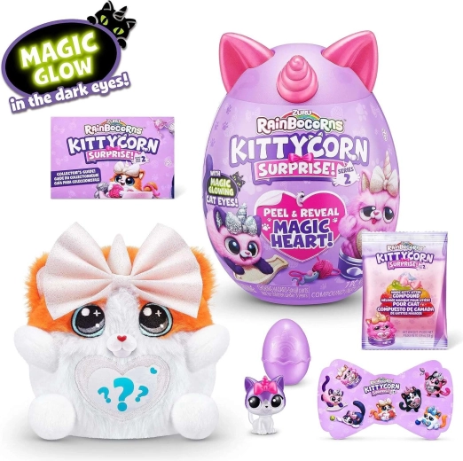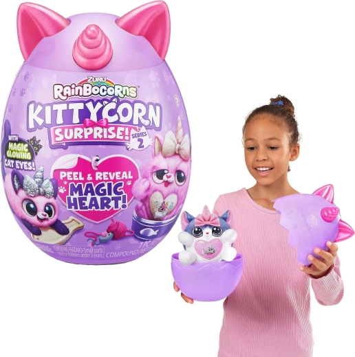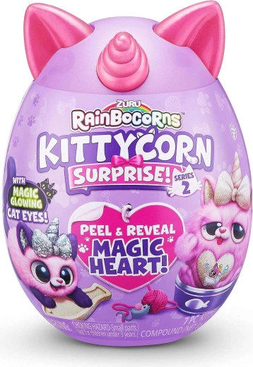 Pasinerkite į staigmenas su RAINBOCORNS KITTYCORN SURPRISE. Violetiniame kiaušinyje jūsų laukia švelnus pliušinis kačiukas su vienaragio ragu, nuimamas širdelės medalionas ir atsitiktiniai priedai, kurie skatina fantaziją ir kūrybišką žaidimą.