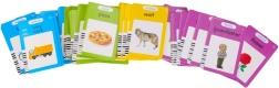 Iš viso 224 paveikslėliai temomis: gyvūnai, transportas, daiktai, maistas, daržovės, vaisiai, šeima, spalvos, formos, profesijos, drabužiai ir gamta – idealiai tinka žodynui plėsti.
