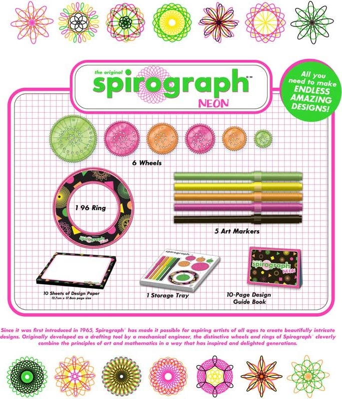 Atraskite geometrijos magiją su Spirografas Neon – kūrybiniu spirografo rinkiniu, su kuriuo vaikai sukurs nesuskaičiuojamą daugybę nuostabių mandalų ir raštų. Skatina kūrybiškumą, smulkiąją motoriką ir loginį mąstymą. Dėl sukamos braižymo sistemos, šablonų ir dantytų krumpliaračių braižyti lengva ir smagu. Tinka vaikams nuo 8 metų.
