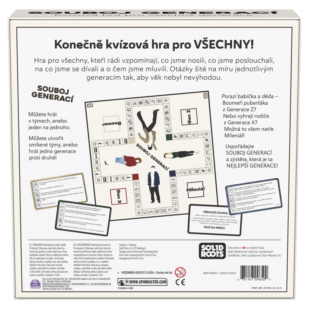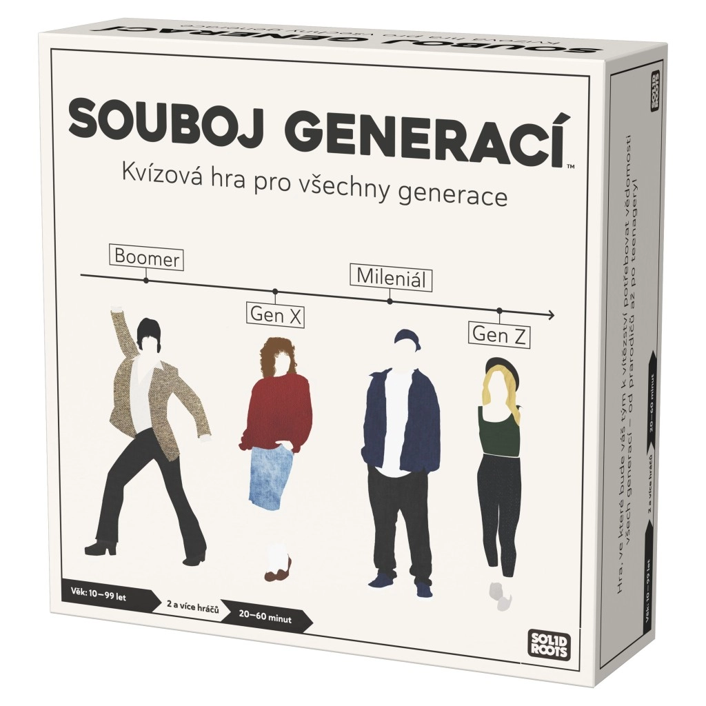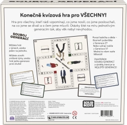Patirkite įtraukiantį žinių dvikovą per laiką! Šis unikalus viktorinos žaidimas 2 ir daugiau žaidėjų patikrins jūsų žinias iš beveik paskutinio šimtmečio. Klausimai suskirstyti į keturis laikotarpius – boomeriai, X karta, tūkstantmečio karta, Z karta – ir apima istoriją, kultūrą, reklamą, madą ir tendencijas. Galima žaisti individualiai arba komandomis, o Iššūkio kortelės patikrins jūsų sumanumą ir įgūdžius. Idealiai tinka šeimai ir vakarėliams, 20–60 minučių, nuo 10 metų. Tik Čekijos rinkai.