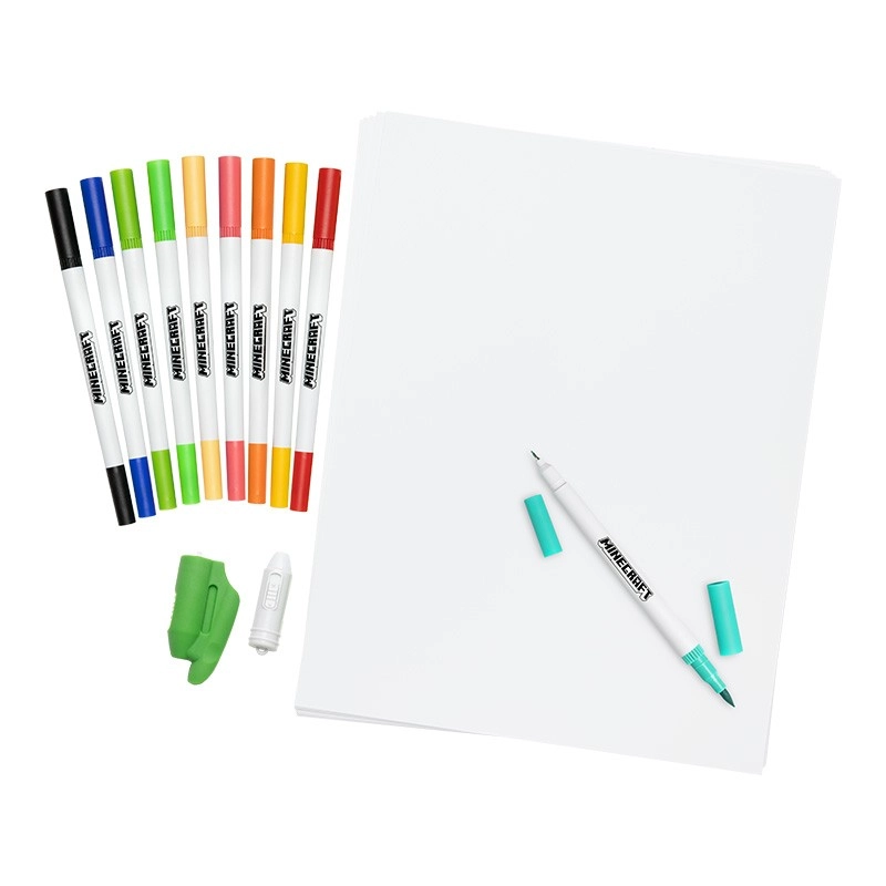 Rinkinyje yra lengvi dvipusiai žymekliai su plonu ir platesniu galiuku tikslioms linijoms ir tolygiam šešėliavimui. Idealu eskizams, kopijavimui ir Minecraft motyvų spalvinimui.