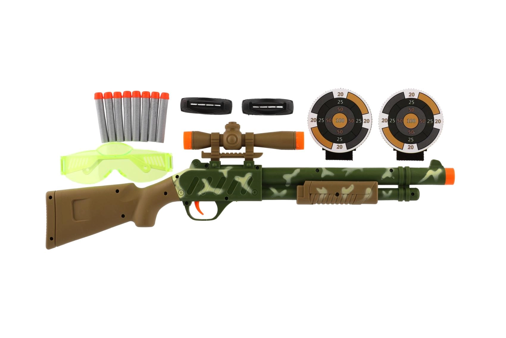 Rinkinyje yra viskas, ko reikia žaidimui: 8 putų šoviniai švelniam ir saugesniam šaudymui bei apsauginiai akiniai didesniam saugumui aktyvaus žaidimo metu. Šautuvo 51 cm dydis patogiai laikosi rankoje ir yra lengvai valdomas.