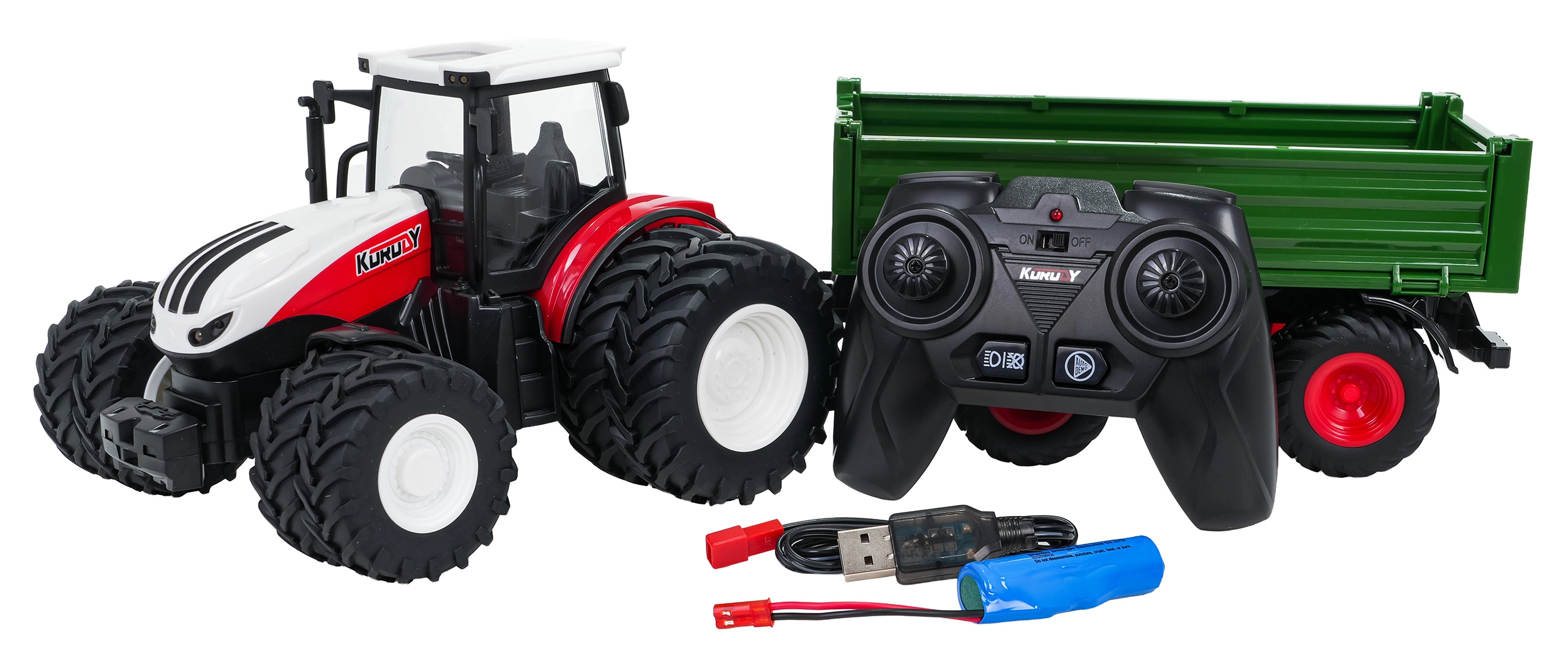 - traktorius su priekaba, 2,4 GHz valdiklis, 3,7 V akumuliatorius, USB įkrovimo kabelis