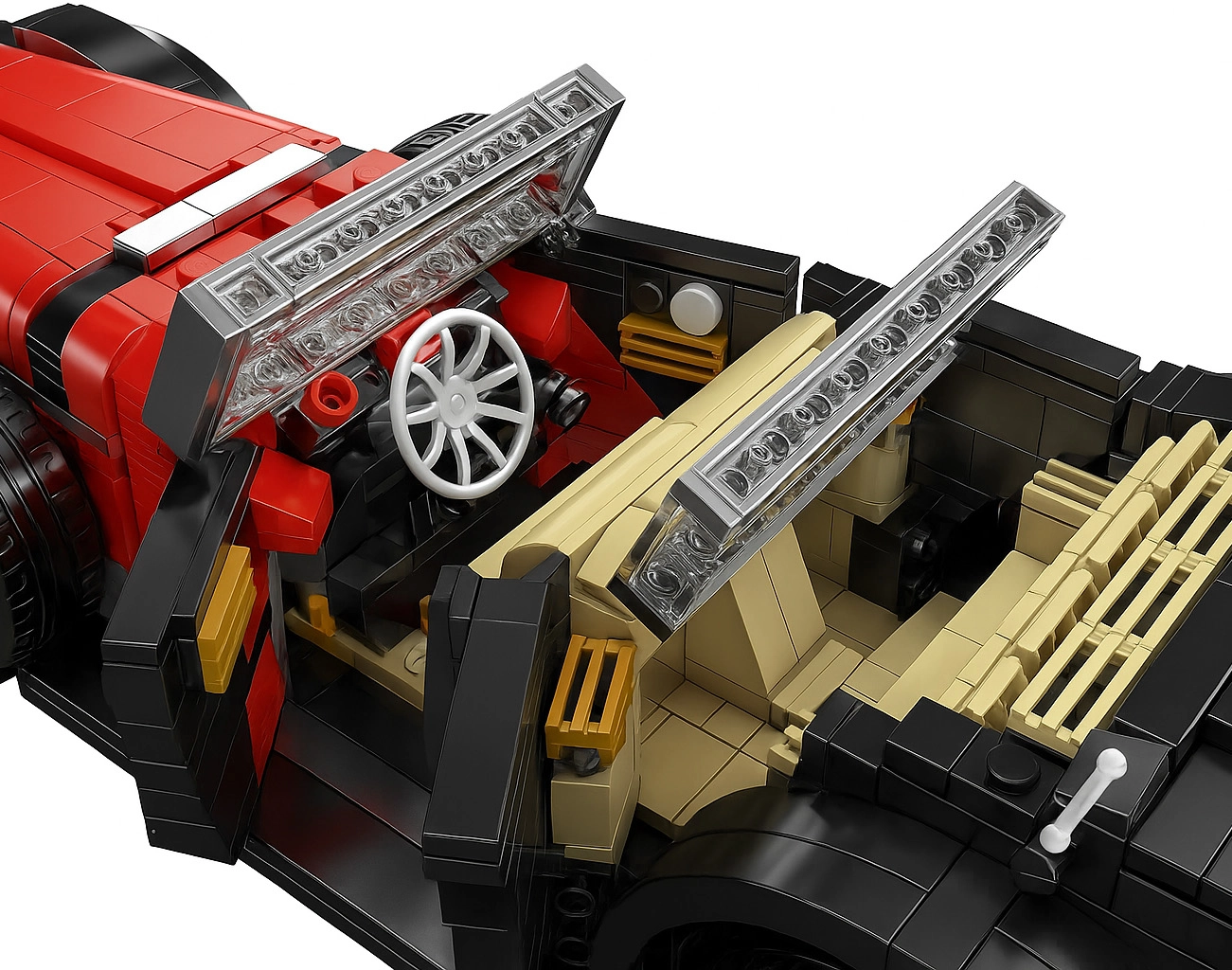 Nukelkite stogą ir paverskite modelį stilingu kabrioletu. Atidaromos durys ir variklio dangtis suteikia prieigą prie detalaus interjero ir mechaninių elementų.
