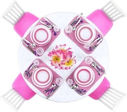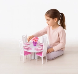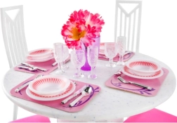 Apvalus stalas, keturios kėdės ir pilnas indų bei stalo įrankių komplektas. Viskas suderinta rožinės ir baltos spalvų derinyje realistiškam serviravimui ir gražiam pateikimui.