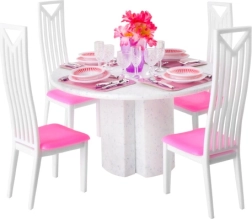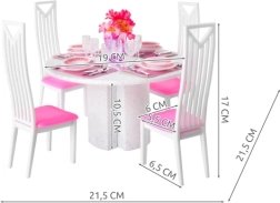 Šis elegantiškas lėlių valgomojo komplektas atkuria realistišką serviravimą miniatiūroje – nuo lėkščių ir stalo įrankių iki taurių ir gėlių dekoracijos. Vaikai lengvai paruoš stalą keturioms lėlėms ir sukurs nesuskaičiuojamą daugybę istorijų. Lengva ir stabili konstrukcija iš patvaraus plastiko užtikrina ilgaamžiškumą net kasdien žaidžiant.