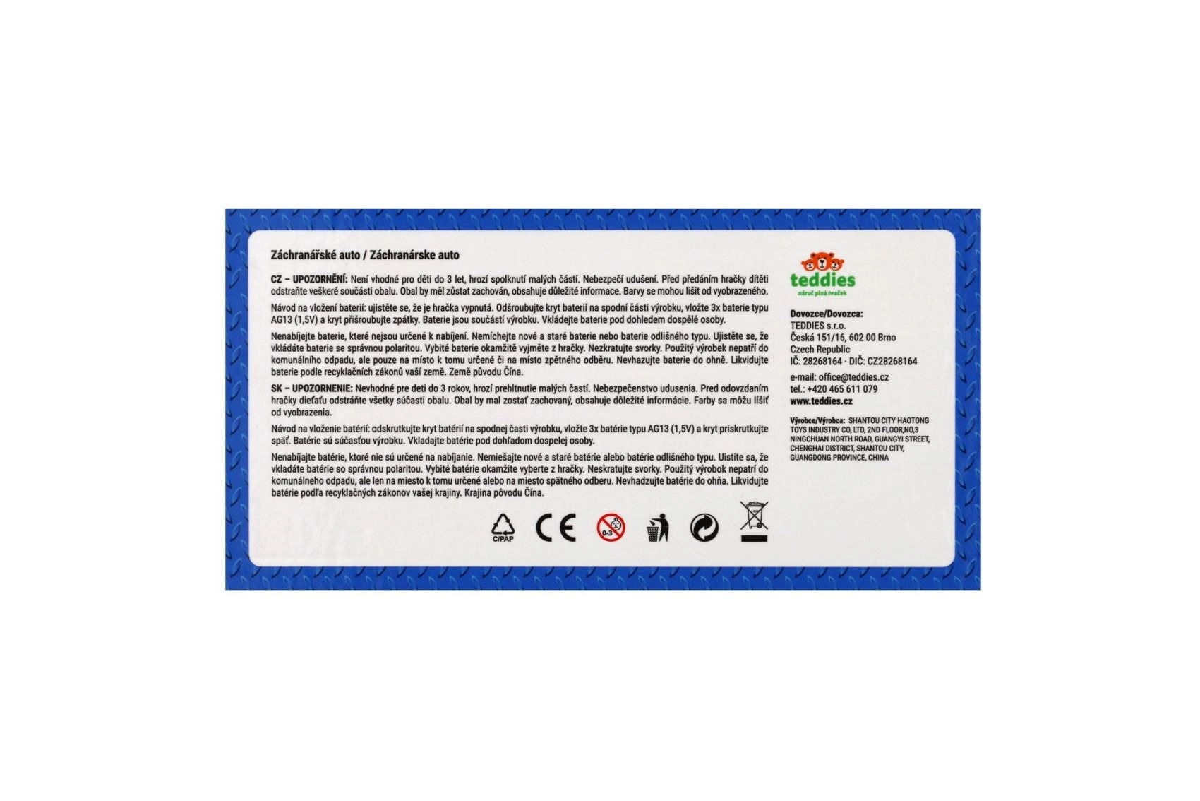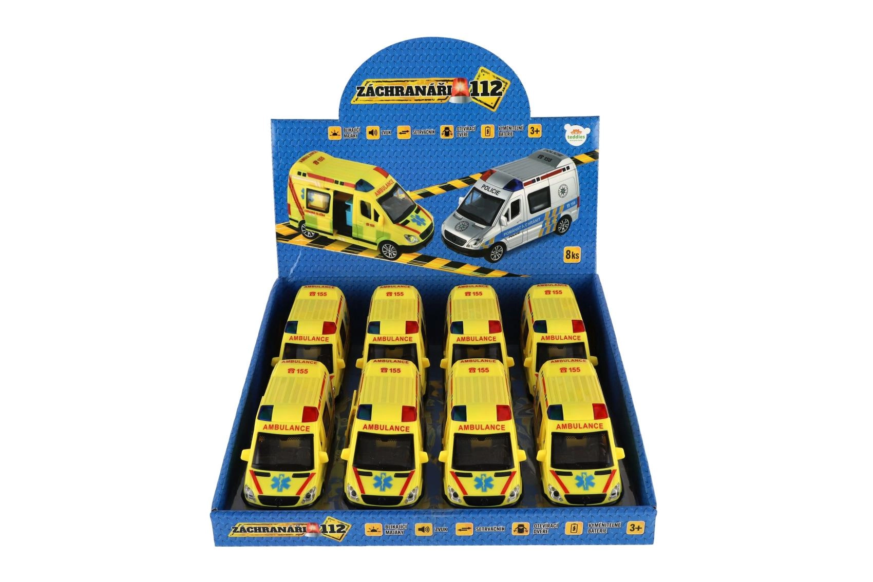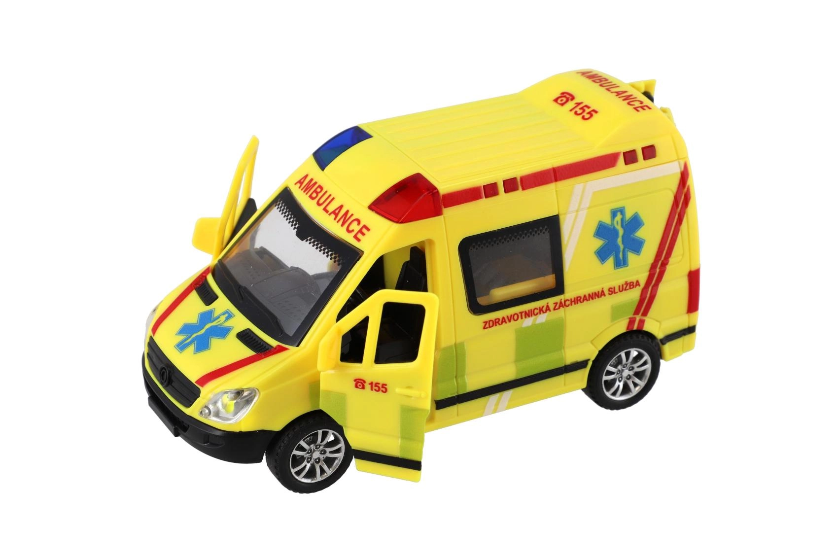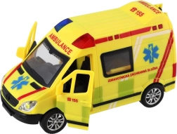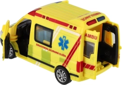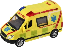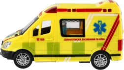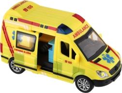 Plastikinė greitosios pagalbos mašina, 14,5 cm ilgio, pradžiugins visus mažus gelbėtojus. Dėl inercinio mechanizmo pakanka pastumti – automobilis pats nuriedės į priekį. Realistiški šviesos ir garso efektai bei atsidarančios durelės skatina kūrybišką žaidimą ir vaizduotę. Tinka vaikams nuo 3 metų.