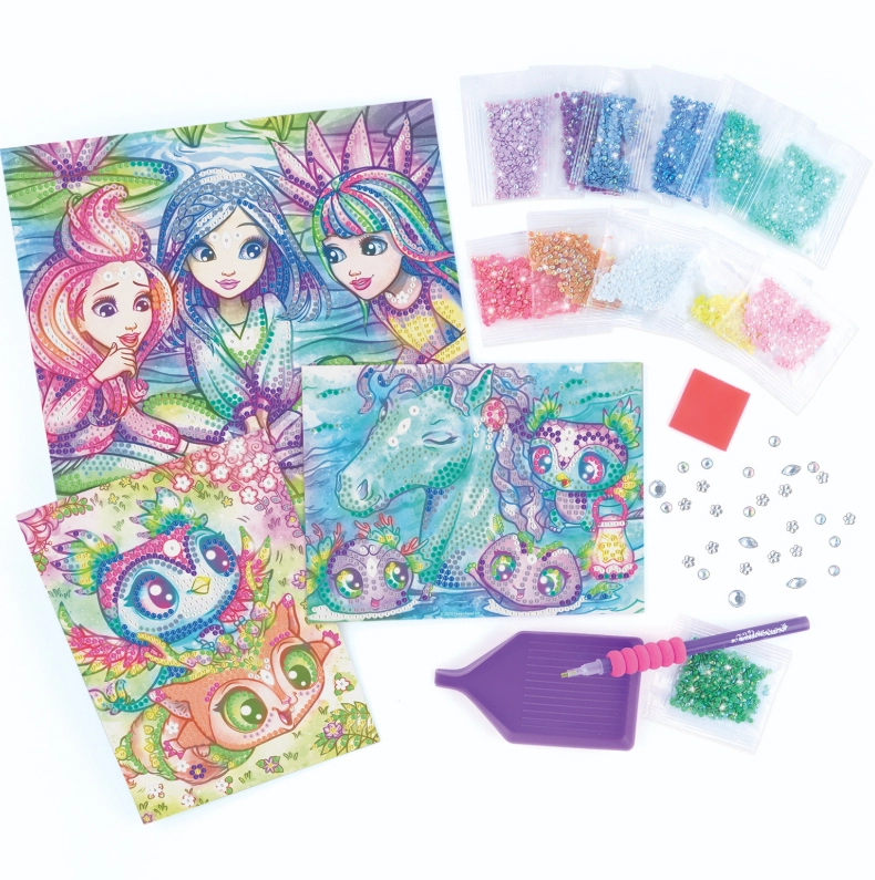 Pakuotėje rasi pilną komplektą: akmenukų aplikatorių, 3 drobes su šablonais, apie 4500 akmenukų, skirstymo dėklą ir spalvotą instrukciją. Kūryba yra intuityvi, raminanti ir padeda ugdyti susikaupimą bei kantrybę.