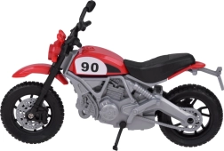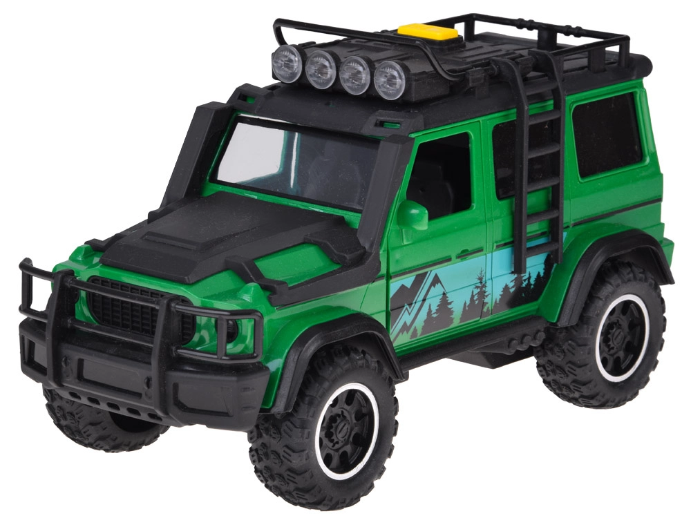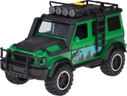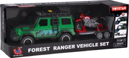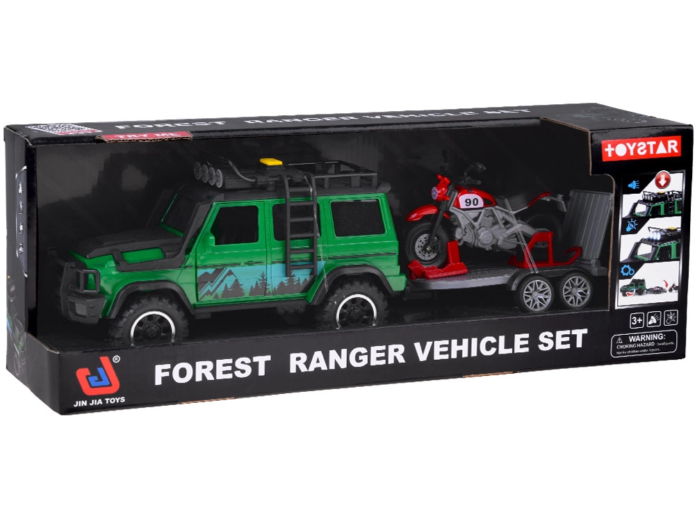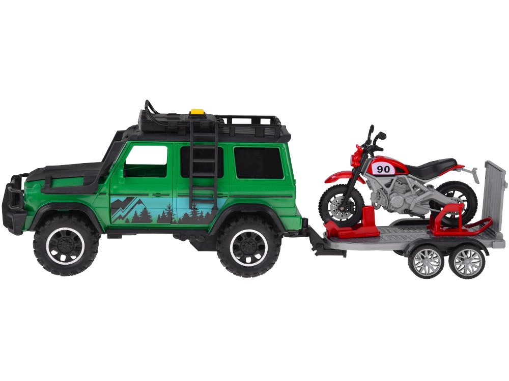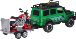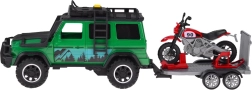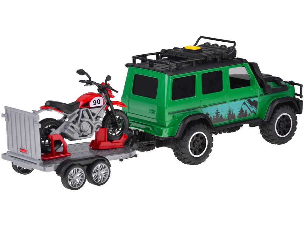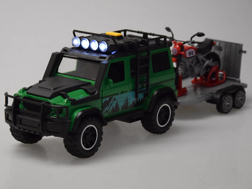 Nuotykių rinkinys mažiesiems vairuotojams: žalias visureigis su atjungiama platformine priekaba ir raudonu sportiniu motociklu. Automobilyje yra šviesos ir garso efektai, atidaromos durys ir guminiai ratai sklandžiam važiavimui. Priekaba turi nuleidžiamą galinę rampą, kad būtų lengva pakrauti ir saugiai pervežti motociklą. Puikiai tinka kūrybiniam žaidimui ir kitų mėgstamų žaislų transportavimui.