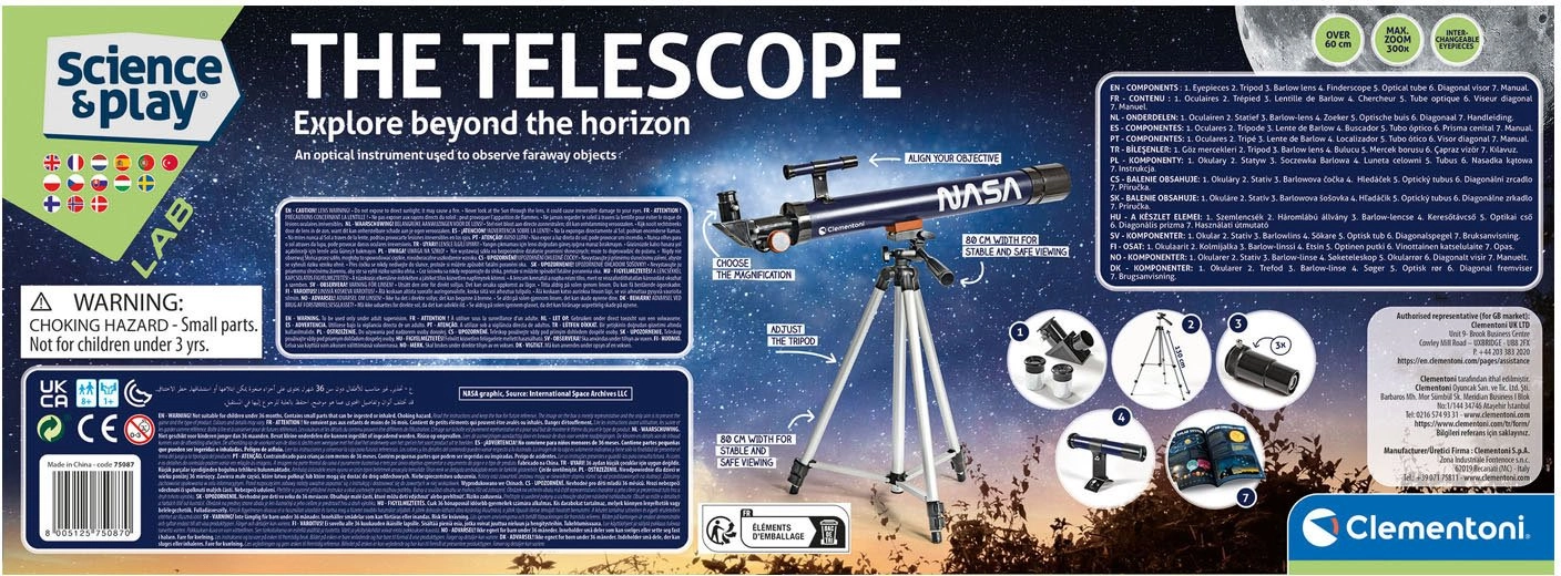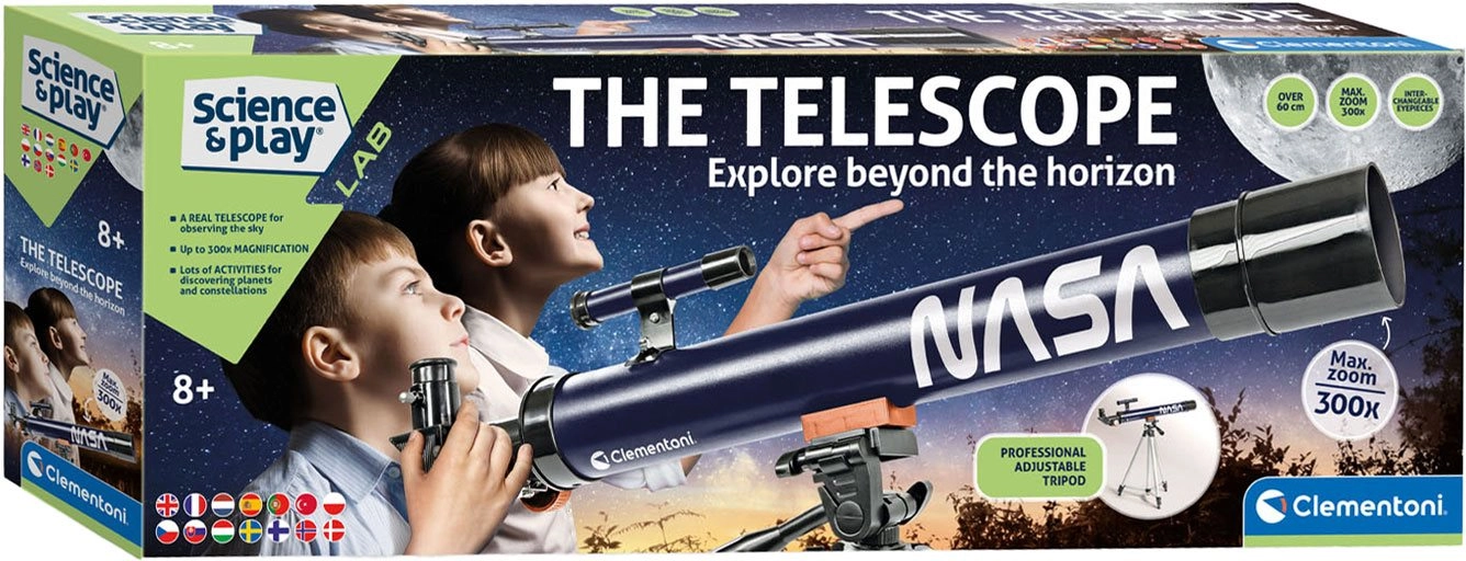 CLEMENTONI Science & Play vaikiškas teleskopas – puikus įvadas į astronomijos pasaulį. Jis suteikia ryškų vaizdą dėl 50 mm skersmens objektyvo ir dviejų keičiamų okuliarų (6 mm ir 12 mm), su kuriais vaikai lengvai tyrinės Mėnulį, žvaigždes ir pagrindinius naktinio dangaus objektus. NASA įkvėpimas ir dėmesys ugdymui daro jį idealiu pasirinkimu mažiesiems tyrinėtojams.