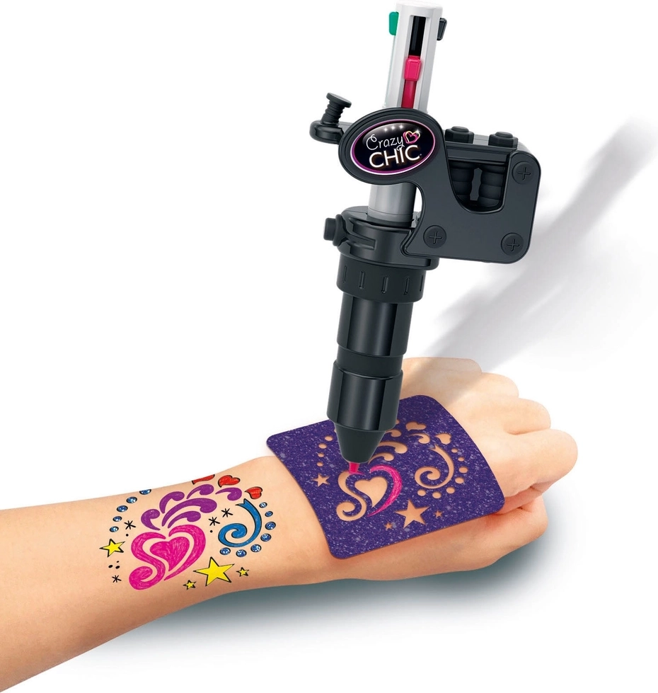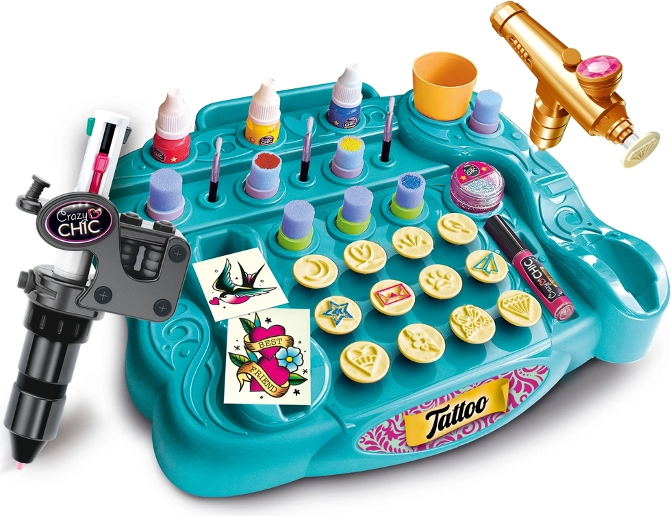 Atrakinkite laikinų tatuiruočių pasaulį su kūrybingu Crazy Chic rinkiniu. Rinkinyje yra viskas, ko reikia kuriant originalius motyvus – piešimas ranka, šablonai ir antspaudai. Dėl įvairių spalvų, blizgučių ir paprasto naudojimo tatuiruotes kurti yra smagu, saugu ir kūrybiška.