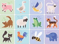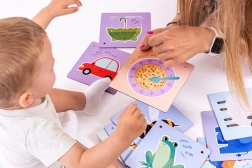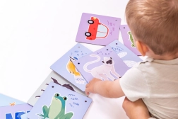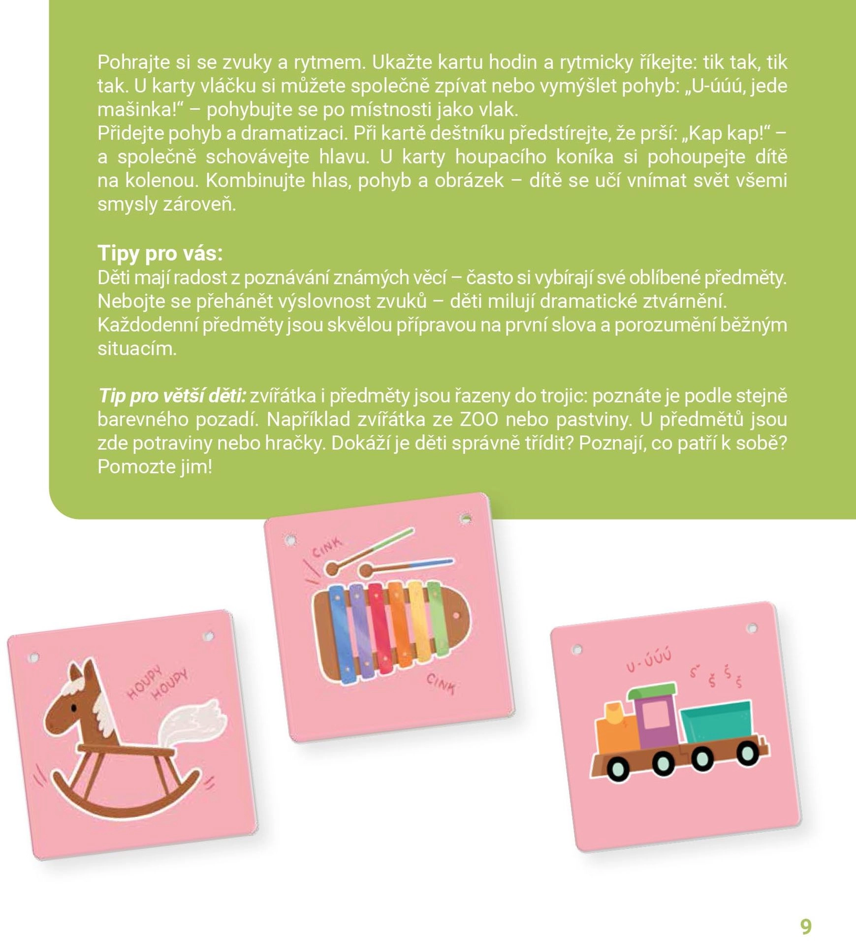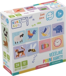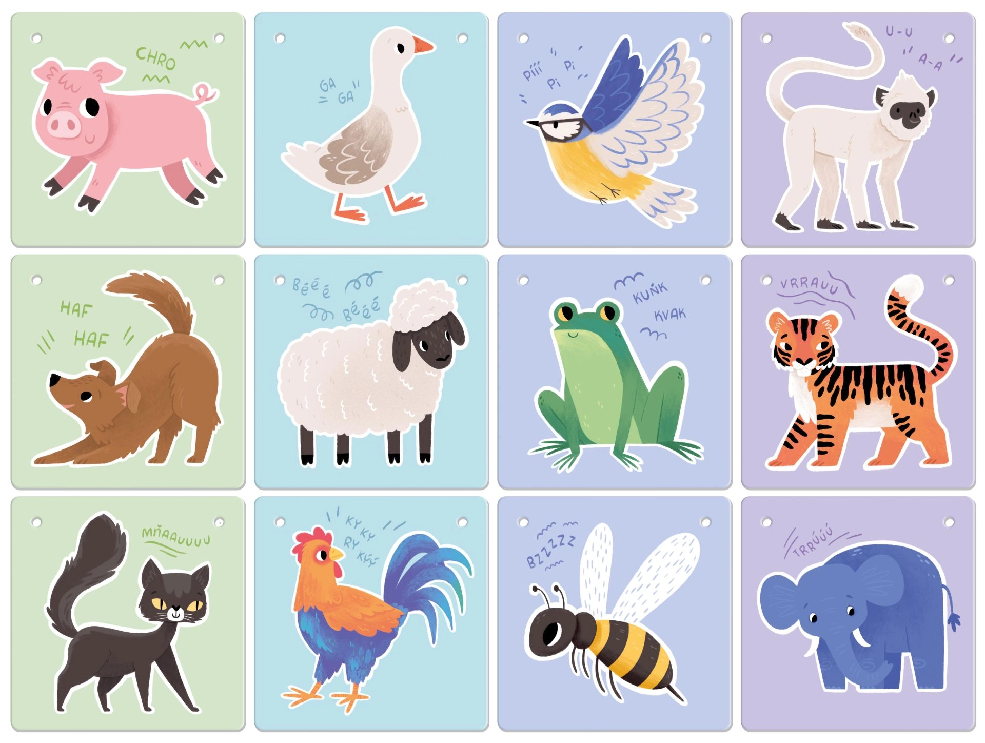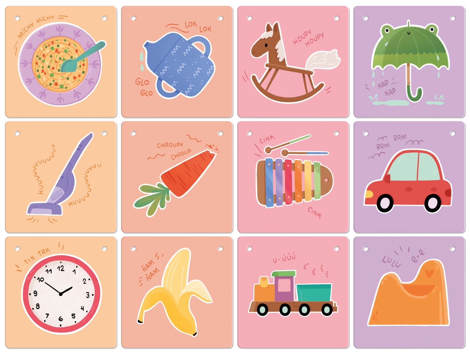 Šis didelio formato kortelių rinkinys sukurtas žaismingam kalbos skatinimui laikotarpiu, kai vaikai pirmiausia mėgdžioja garsus, o tik vėliau kuria žodžius. Ryškios, aiškios iliustracijos su grafinėmis užuominomis skatina vaikus kartoti garsus, tokius kaip „miau“, „brrr“ ar „au au“, taip natūraliai lavinant klausos diferenciaciją, atmintį ir kalbos ritmą.