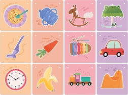 12–30 mėnesių laikotarpiu kalbos raida labiausiai skatinama mėgdžiojant garsus. Garsų kartojimas stiprina kalbos aparato motoriką (lūpas, liežuvį, minkštąjį gomurį), padeda suvokti kalbos melodiją ir tempą bei sudaro žodyno pagrindus. Taip kortelės tampa puikiu tiltu nuo garsų iki pirmųjų žodžių.