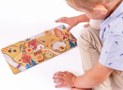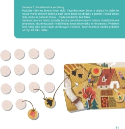 Vaikai savarankiškai atranda, rūšiuoja ir priskiria žetonus paruoštiems paveikslams. Lavina pastabumą, loginį mąstymą ir žodyną.