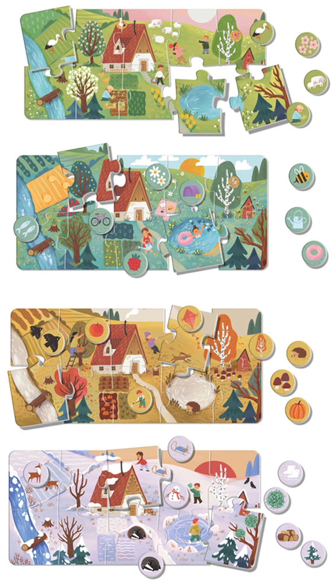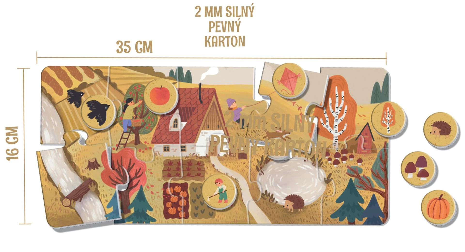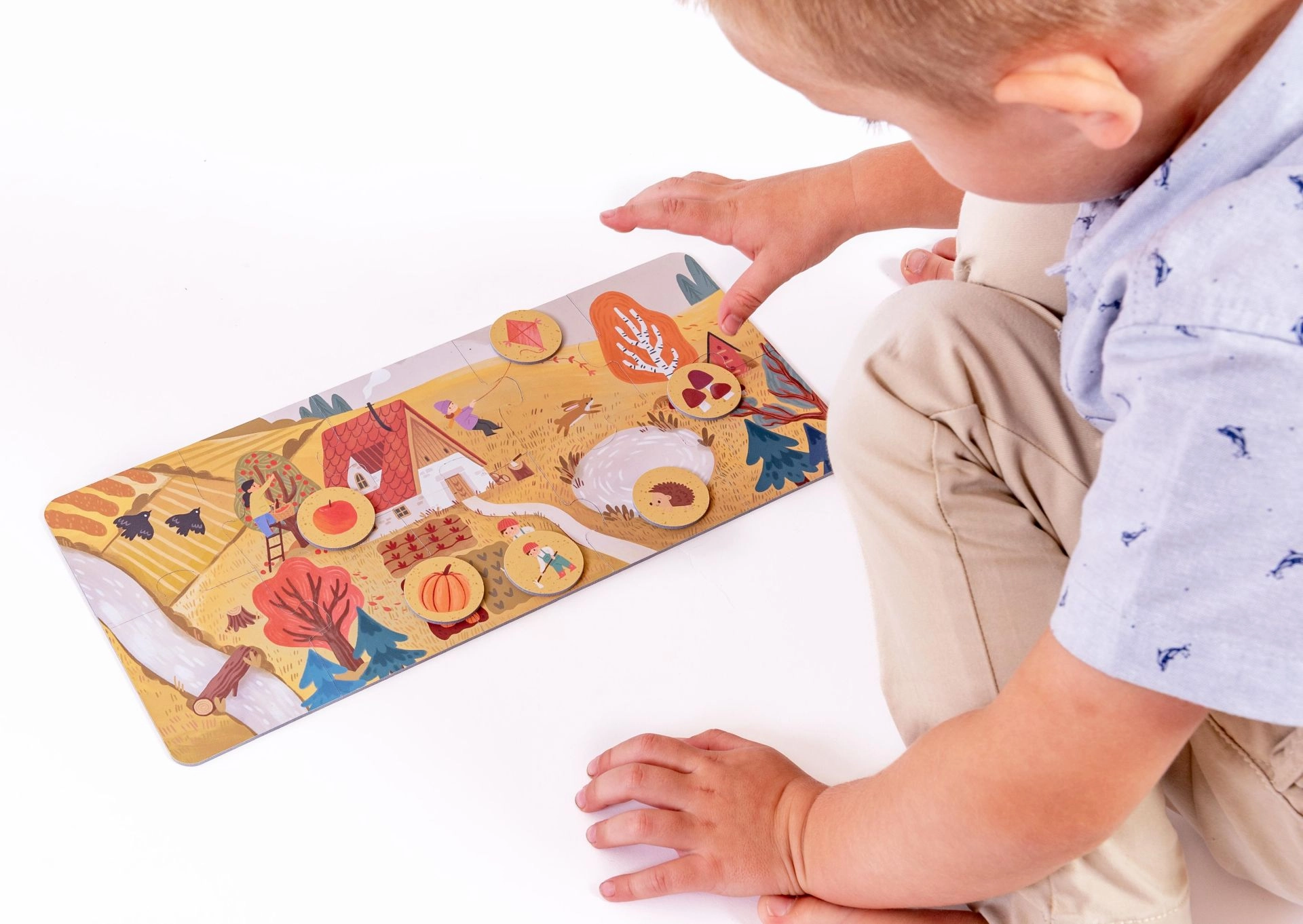 Žaidimas sukurtas mažoms rankutėms: itin didelės detalės iš 2 mm FSC kartono yra patvarios, lengvai sugriebiamos ir visiškai be plastiko. Mokymasis vyksta natūraliai – vaikai lavina dėmesį, plečia žodyną ir kalbasi apie pokyčius gamtoje per metus.