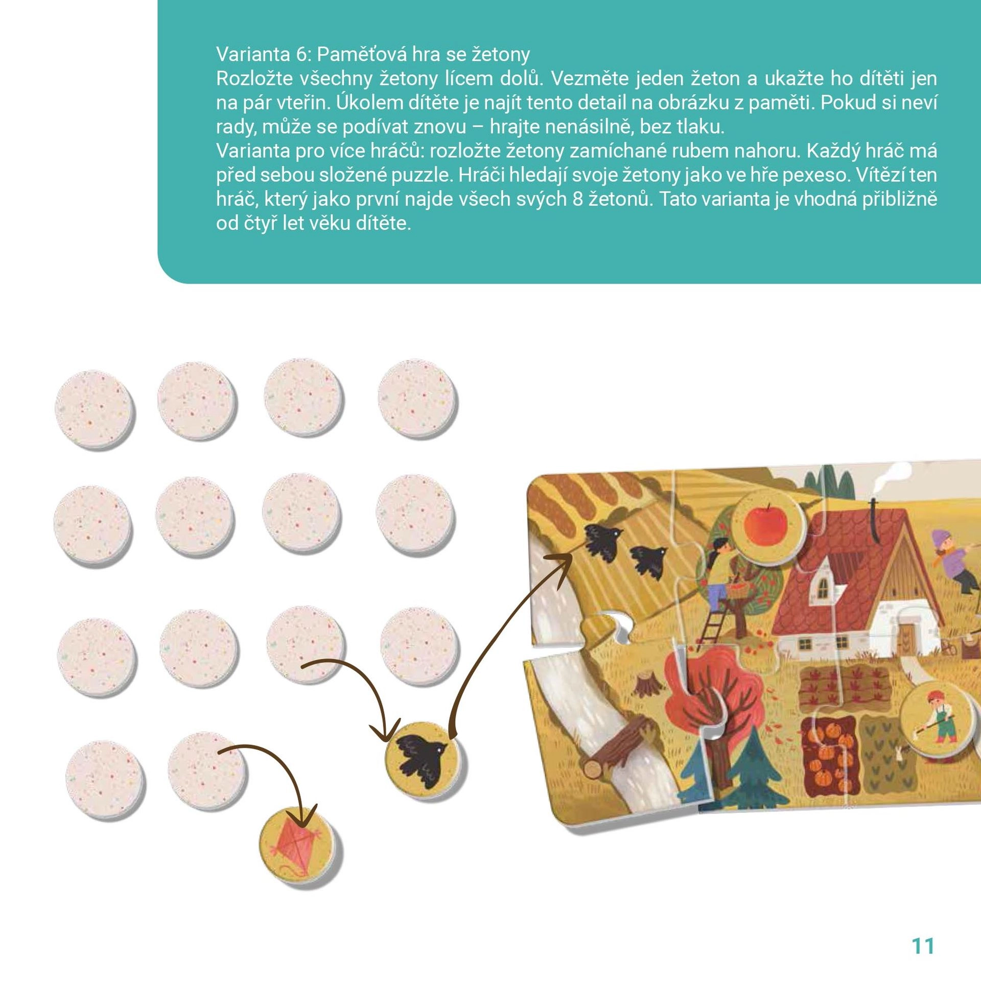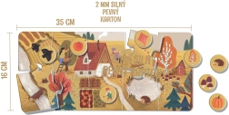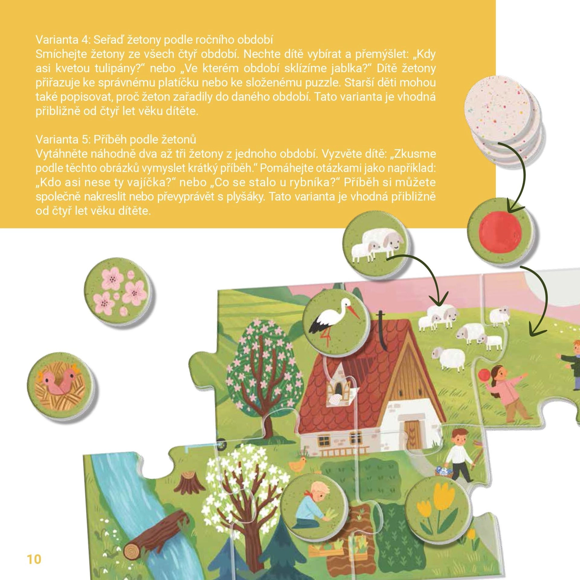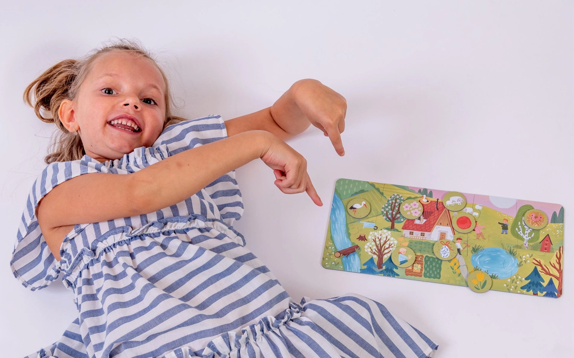 Žaidimas sukurtas mažoms rankutėms: itin didelės detalės iš 2 mm FSC kartono yra patvarios, lengvai sugriebiamos ir visiškai be plastiko. Mokymasis vyksta natūraliai – vaikai lavina dėmesį, plečia žodyną ir kalbasi apie pokyčius gamtoje per metus.