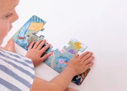 Itin didelės dėlionės detalės iš 2 mm FSC kartono patogiai laikomos, lengvai dėliojamos ir atlaiko kasdienį žaidimą be plastiko.