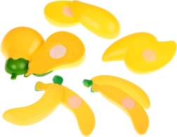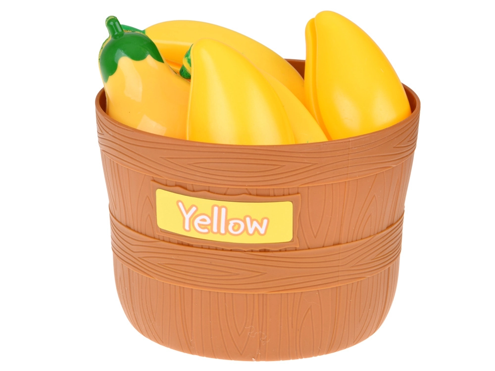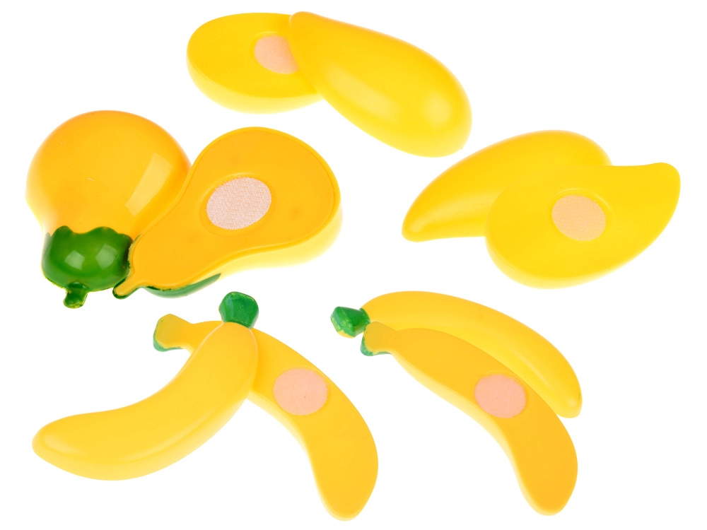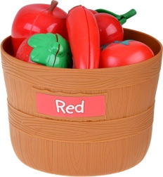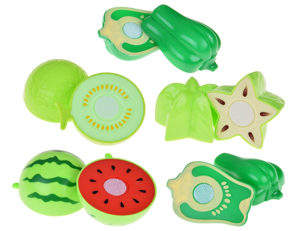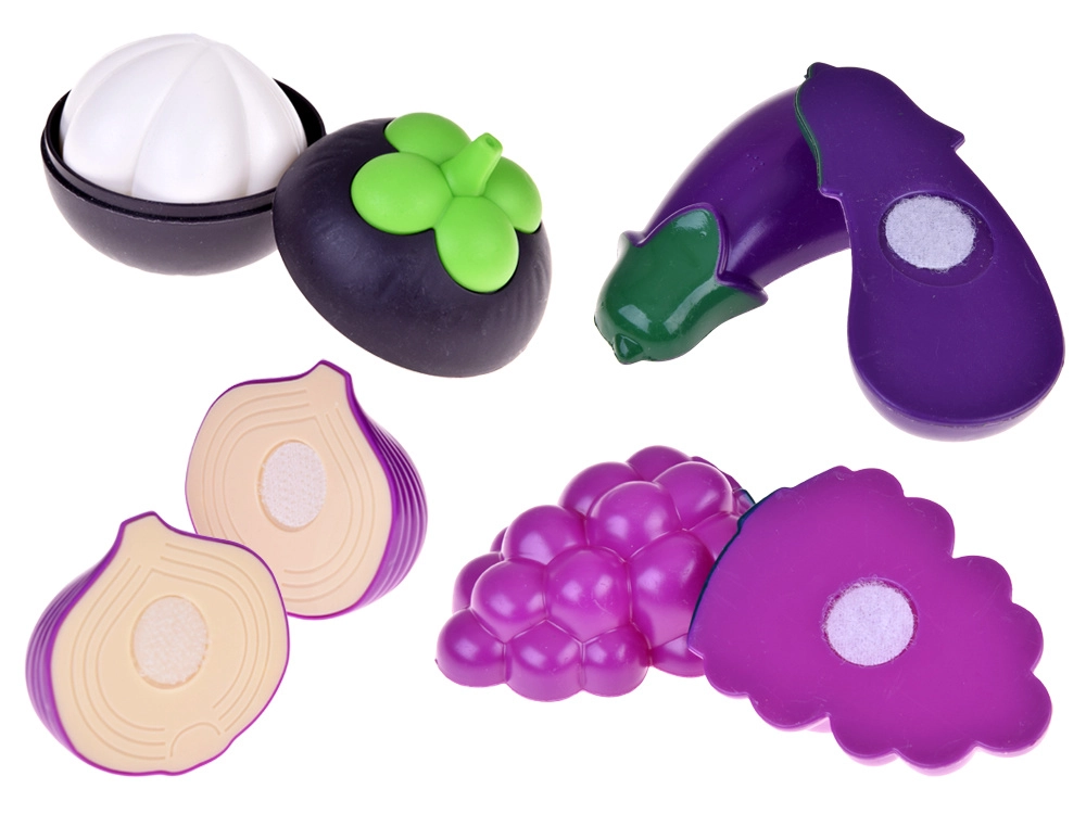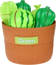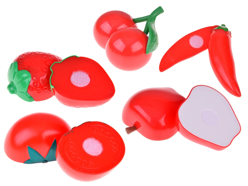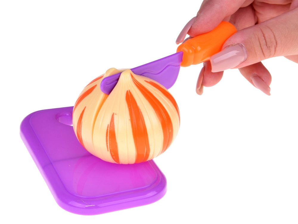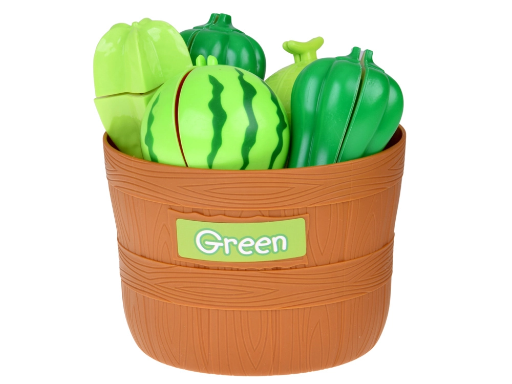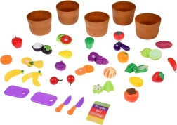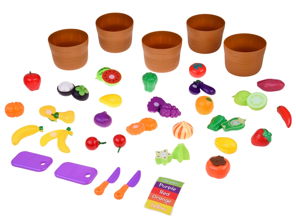 Rinkinyje yra patvarūs krepšeliai su spalvotomis etiketėmis, dvi pjaustymo lentelės ir du saugūs peiliai teisingam suėmimui ir akies-rankos koordinacijai lavinti. Žaidimas ugdo smulkiąją motoriką, loginį mąstymą, žodyną ir kūrybiškumą.