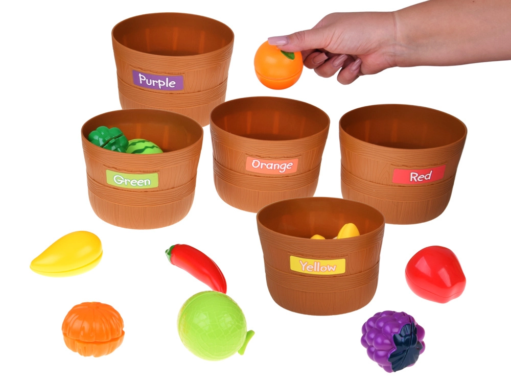 Penki krepšeliai su spalvotomis etiketėmis motyvuoja vaikus rūšiuoti maistą pagal spalvą. Puikus pagrindas ankstyvam suvokimui ir logikos raidai.