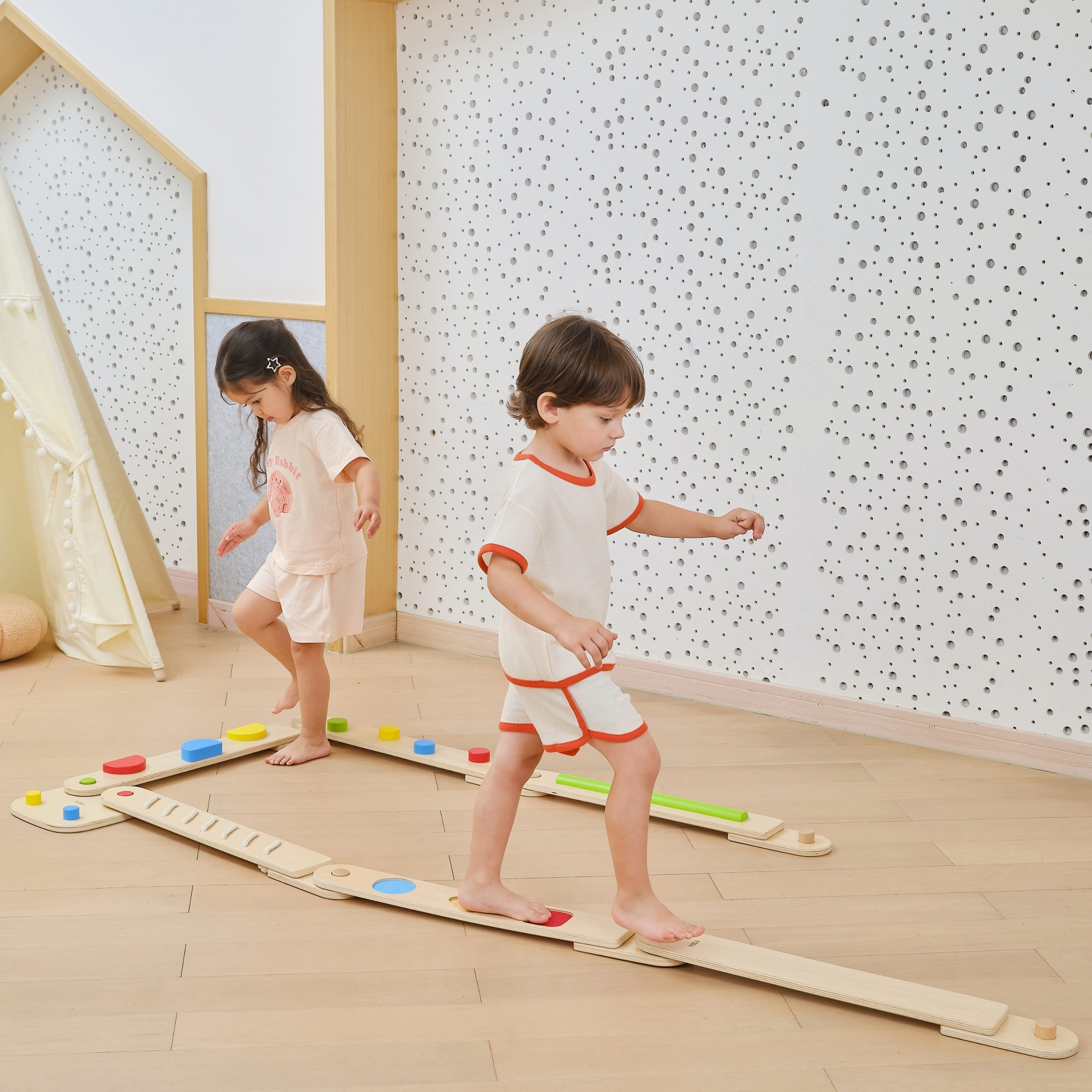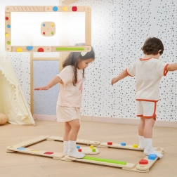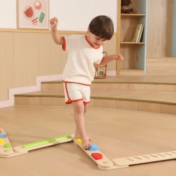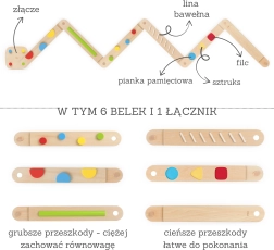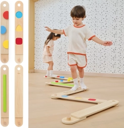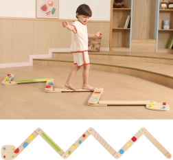 Ši aukštos kokybės medinė balansavimo trasa skatina natūralų judėjimą, kūno pojūtį erdvėje ir žaismingai treniruoja pusiausvyrą bei stabilumą. Kiekviena lenta siūlo skirtingus taktilinius dirgiklius – spalvotus iškilimus, griovelius ar formas – kurie motyvuoja eiti, perstatinėti pėdas ir planuoti žingsnius.